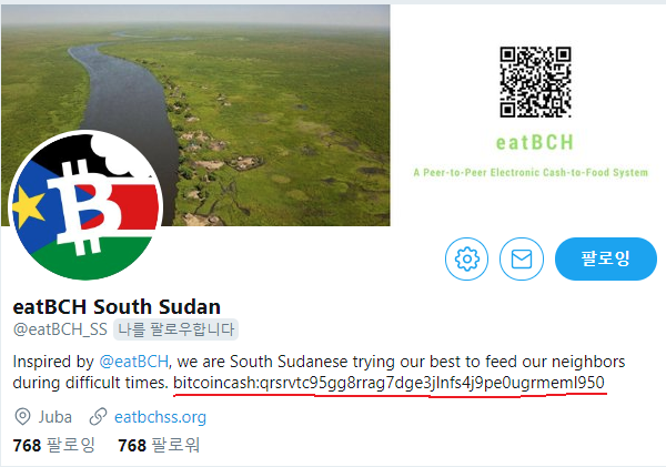 남수단 비캐 봉사단 비트코인캐시 기부 주소 : bitcoincash:qrsrvtc95gg8rrag7dge3jlnfs4j9pe0ugrmeml950
