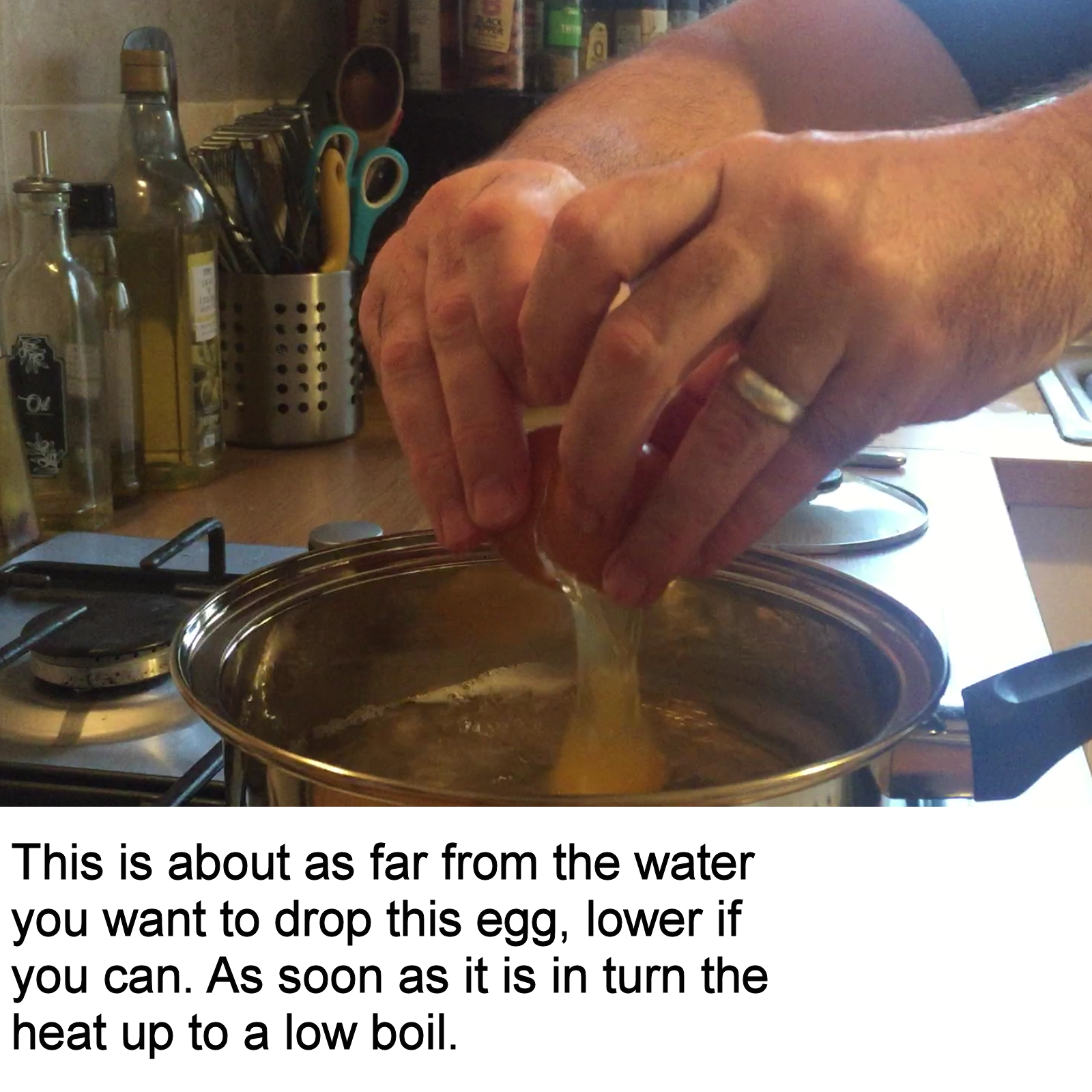 So you can do this in a few different ways, once the water is boiling like mad you can turn it down for a few seconds while you get that egg in. I prefer the one handed approach (Most chef's probably do it one handed !) or you can crack it with a knife and part the shell with both hands so that the egg drops into the water. once the egg is in the pan you need to turn the heat back up so that the water continues to boil.