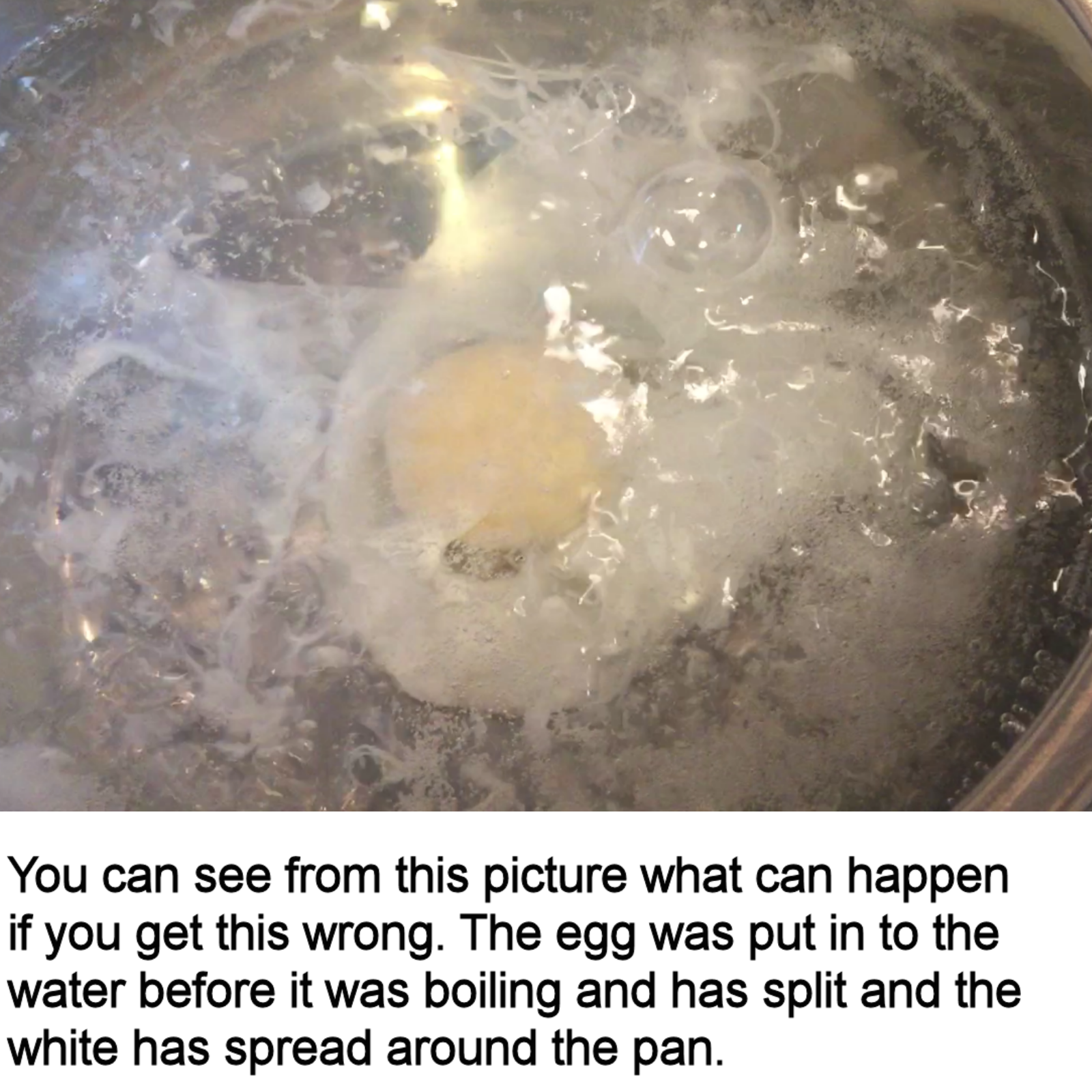 Lets take a look at a few mistakes folks make. The number one has to be water temperature. Remember that the water you are going to poach your eggs in has to be boiling !! All too often is the case that you drop your egg into the pan while the water is not boiling and the white of the egg splits and runs all through the water.