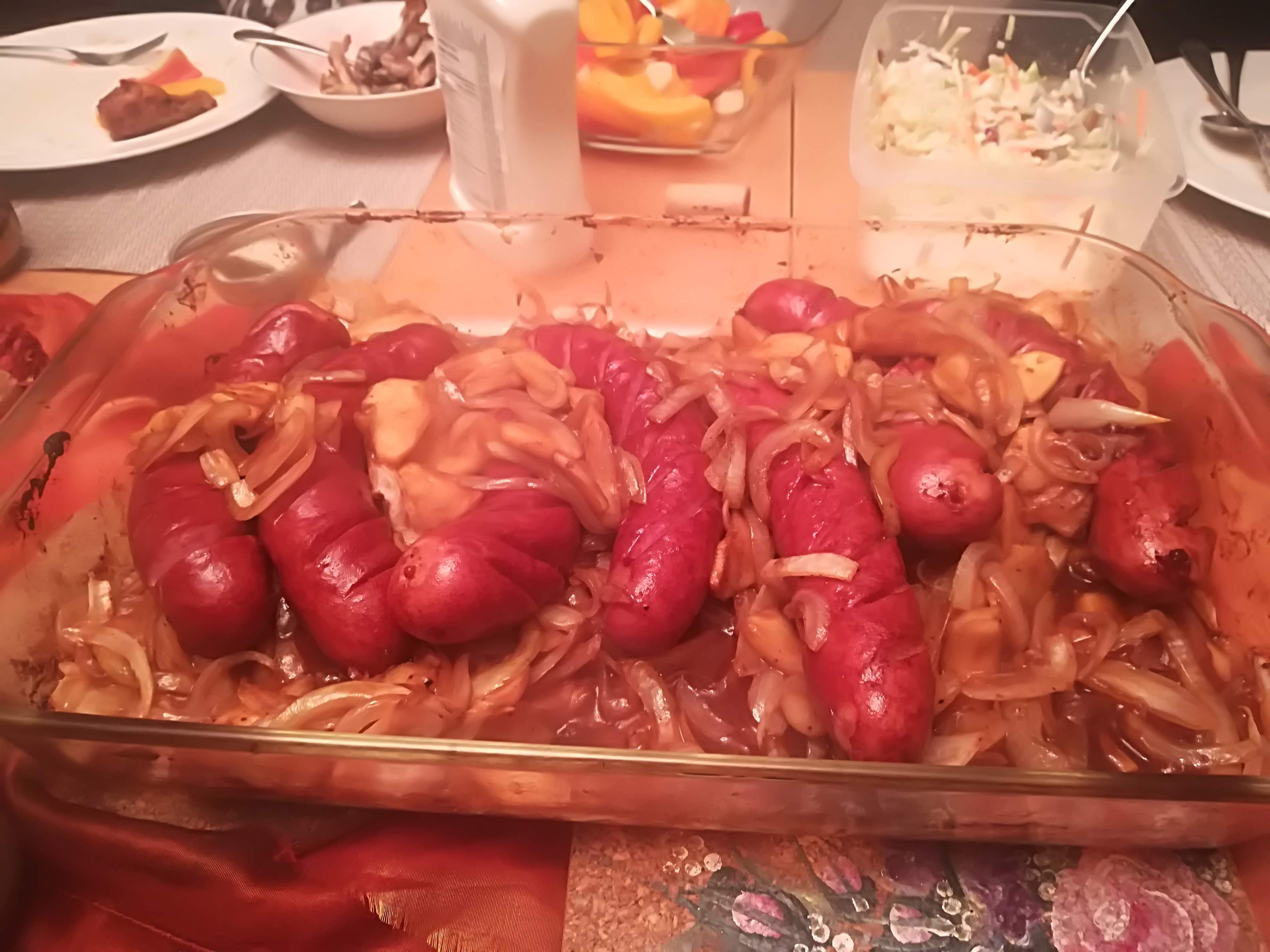 Polish sausage with sliced onions.