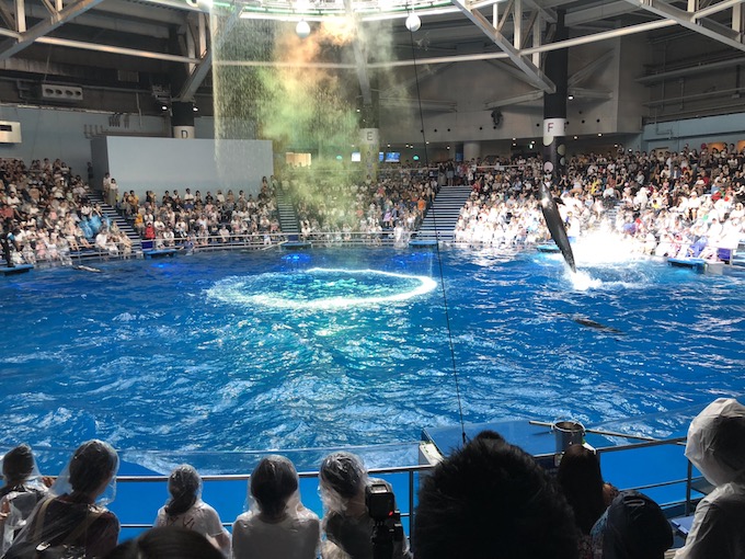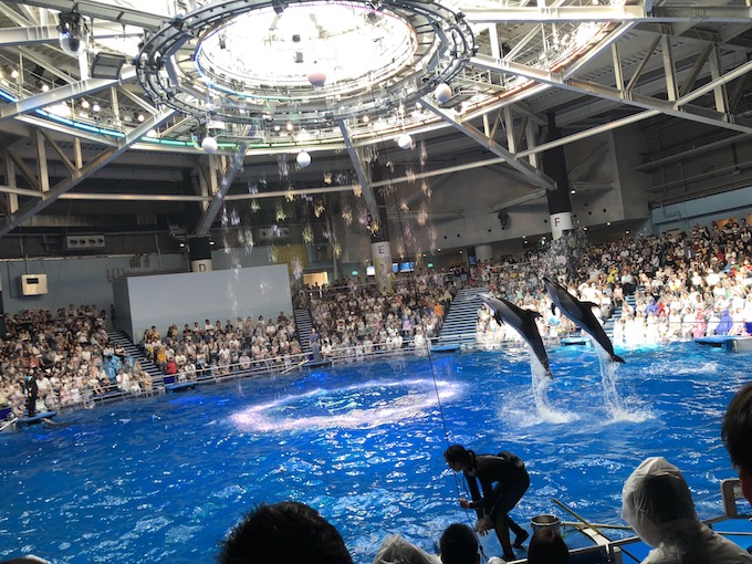イルカショーは水が上から降ってきていてそこのライトでいろいろな