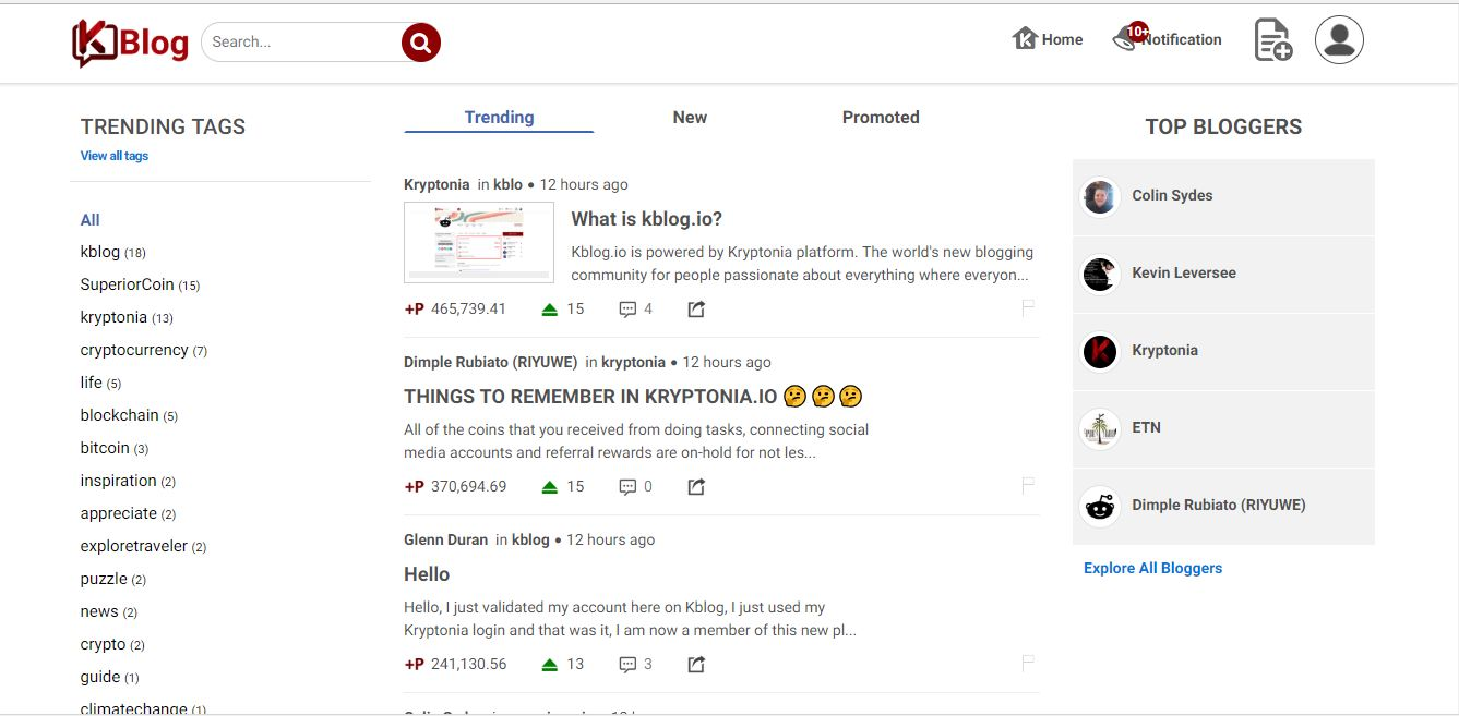 After entering Kblog.io this will be your home page where you can see on the right side all the labels that bloggers have done helping users and readers to filter the publications for each label. On the left side the bloggers that have done more publications, and at the top you will see the trends, the newest and what is being promoted.