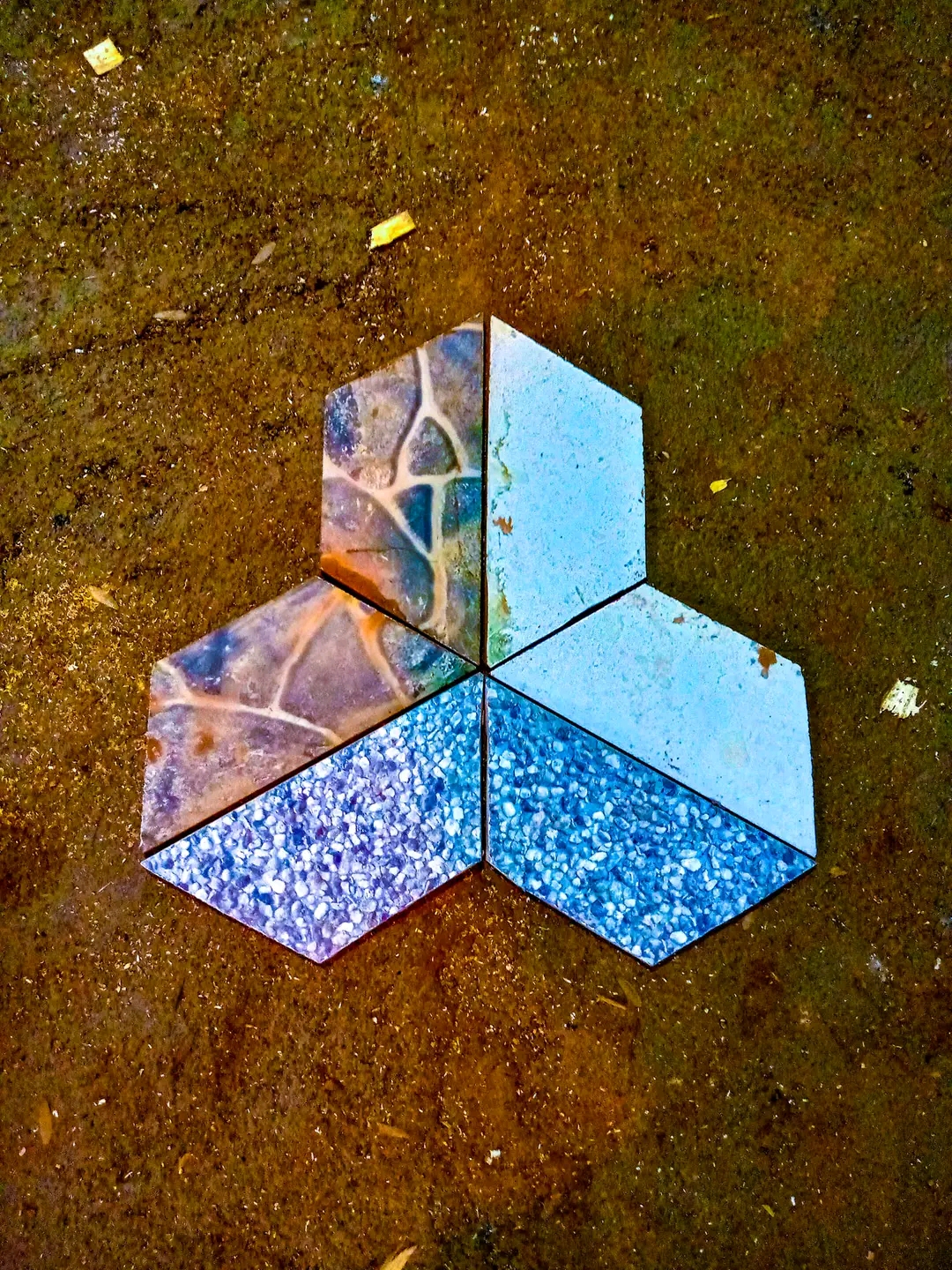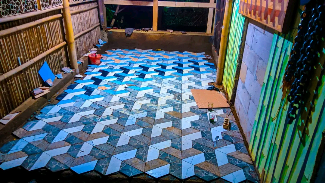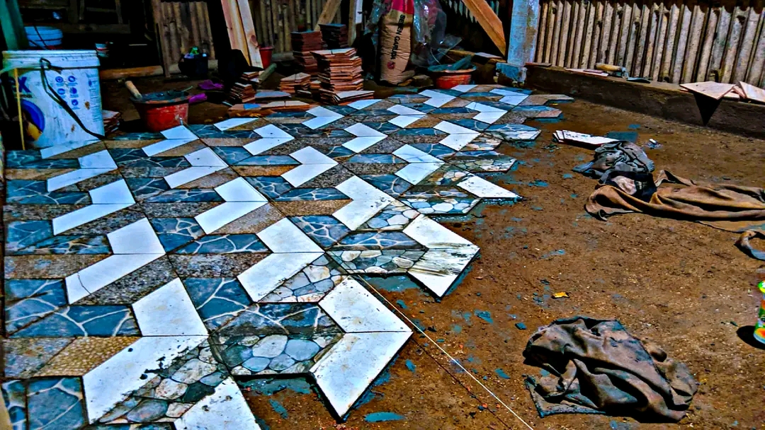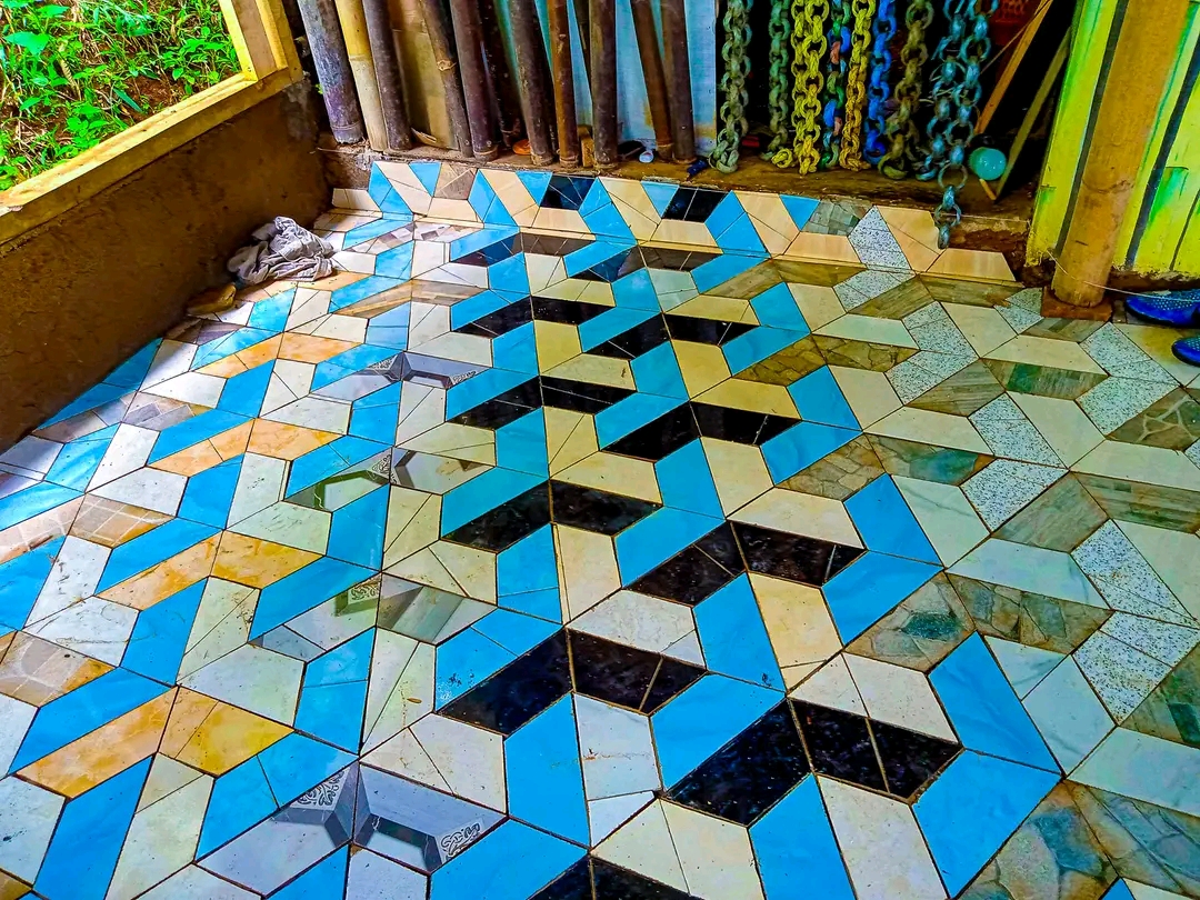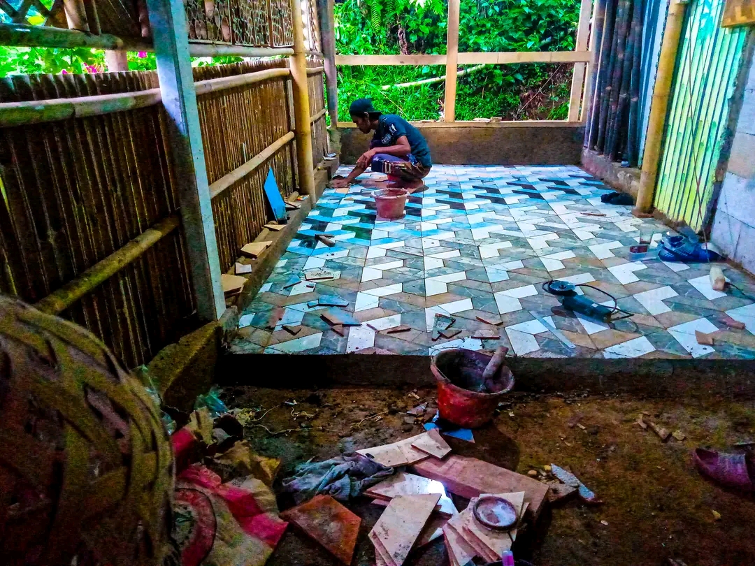 Keramik yang pecah dipotong sesuai ukuran dan dipadukan dengan keramik yang lain.