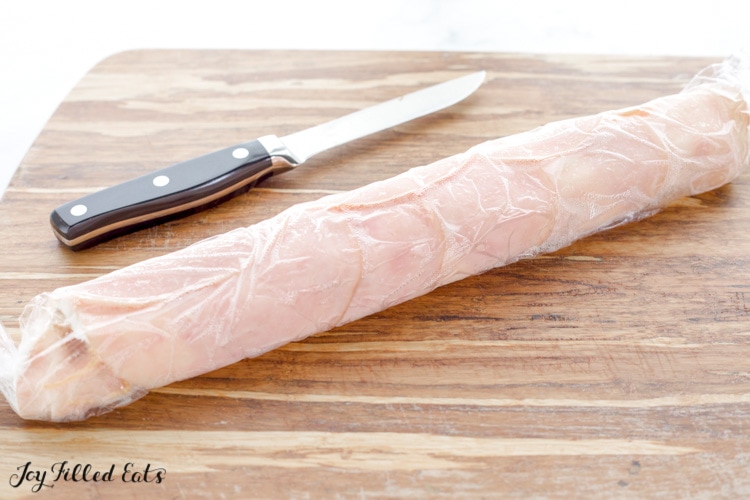 Turkey cheese pinwheels should be rolled up. Add extra rolls. Roll up and cover with the plastic wrap that was below.