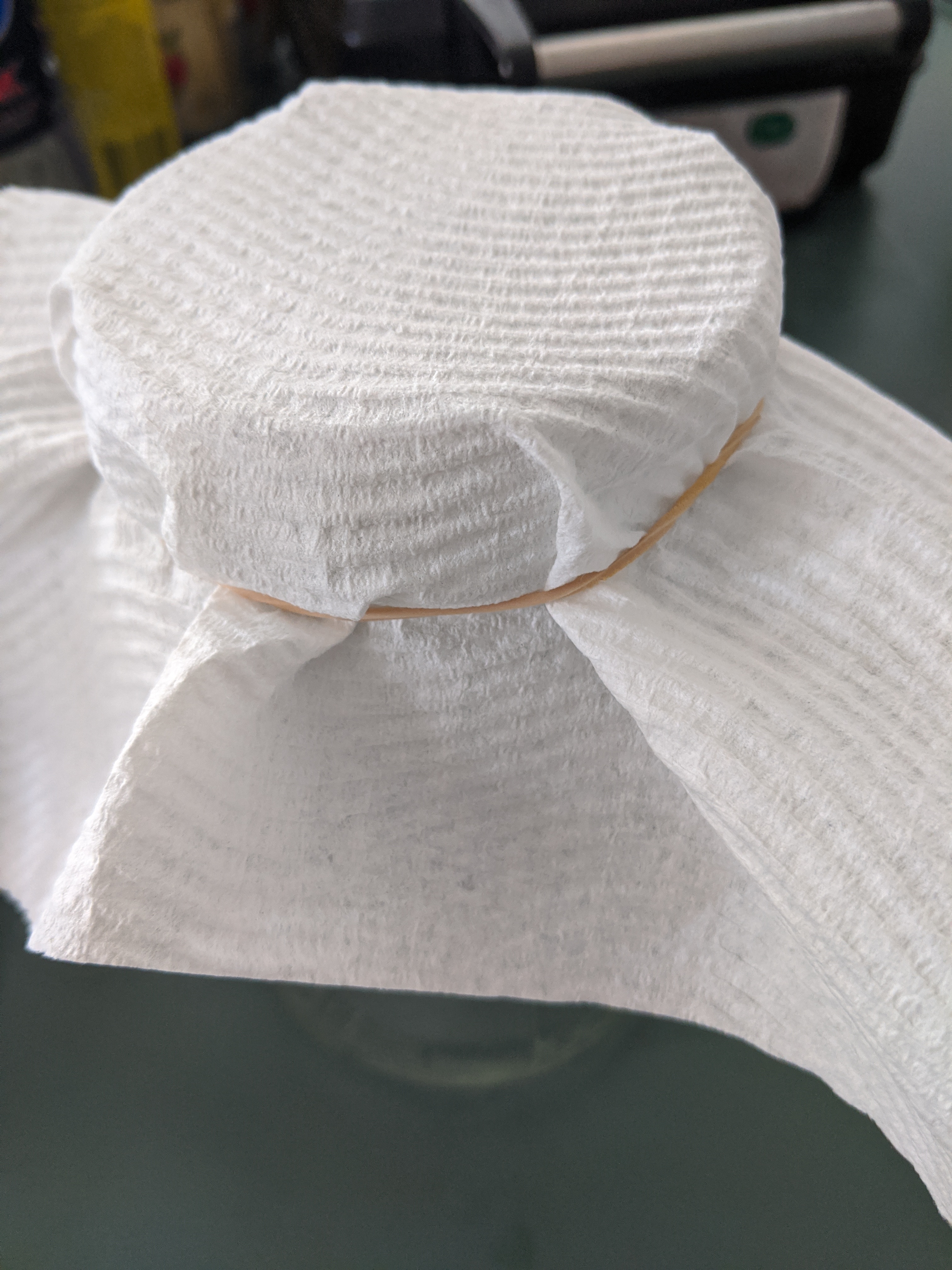 The tutorial lady said use cling wrap and I'm like "No plastic!" so I devised a means of creating a non-perfect seal in a re-usable form - Paper towels and/or judiciously loosening the lid of the mason jar. The former was to keep cat hair, flies, and other non-welcome pestilence out of the forming sourdough, whilst also allowing the welcome microbes in.