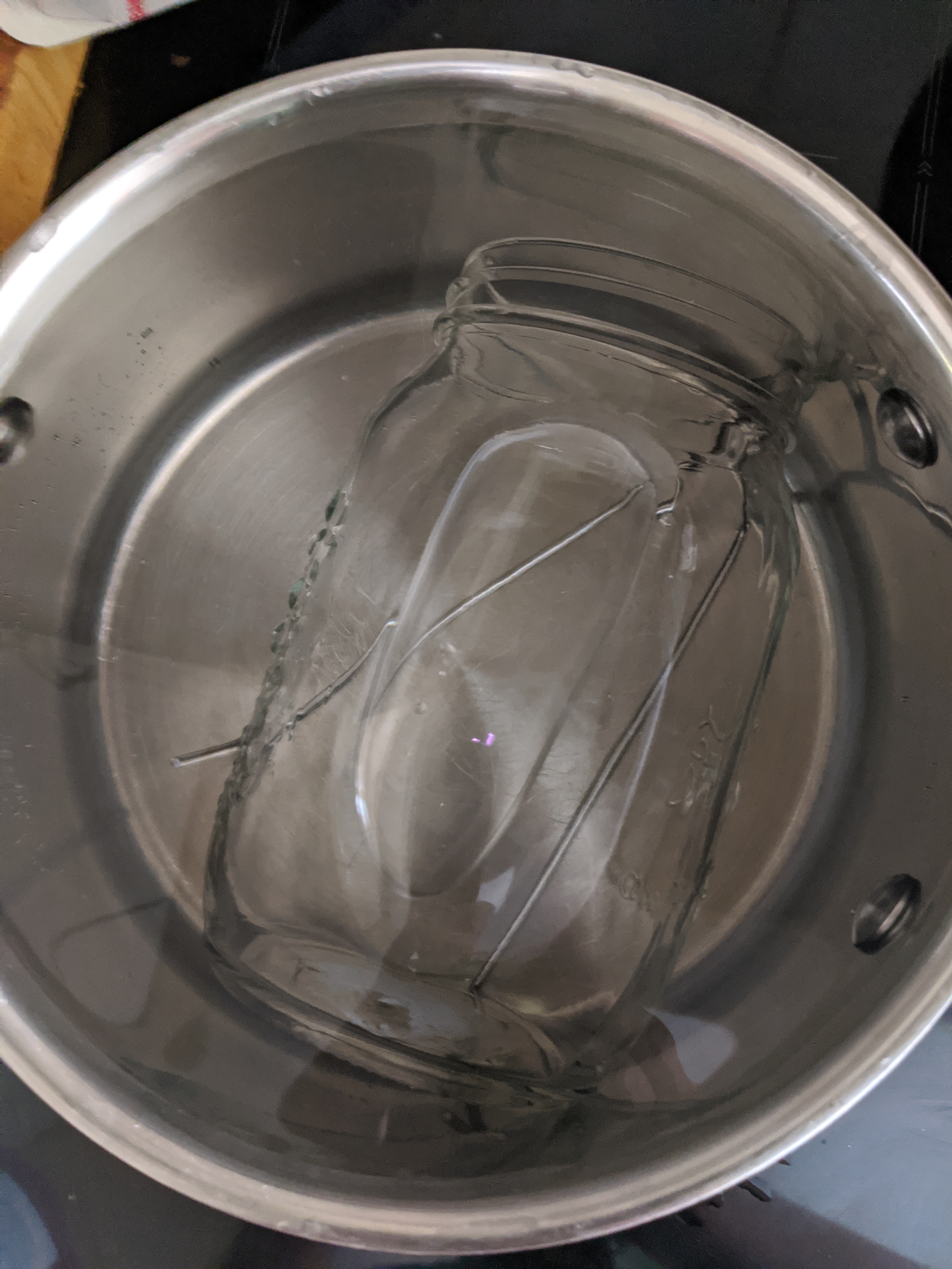 Since the dollar shop was now out of mason jars, I was super paranoid about them being really clean as well as accidentally breaking them. So. In a pot full of filtered water, I put down a trivet piece and boiled the heck out of the glass for ten minutes.