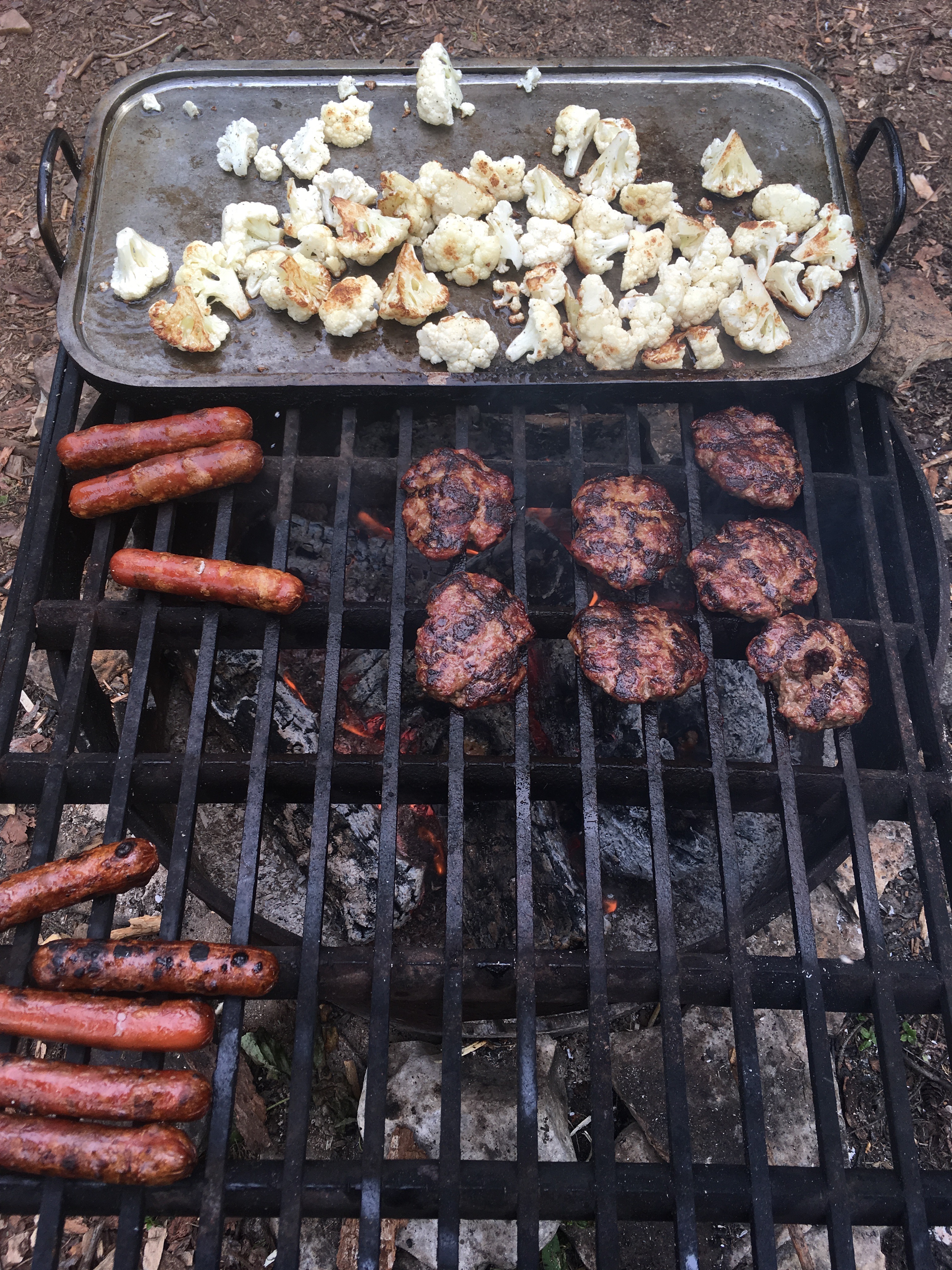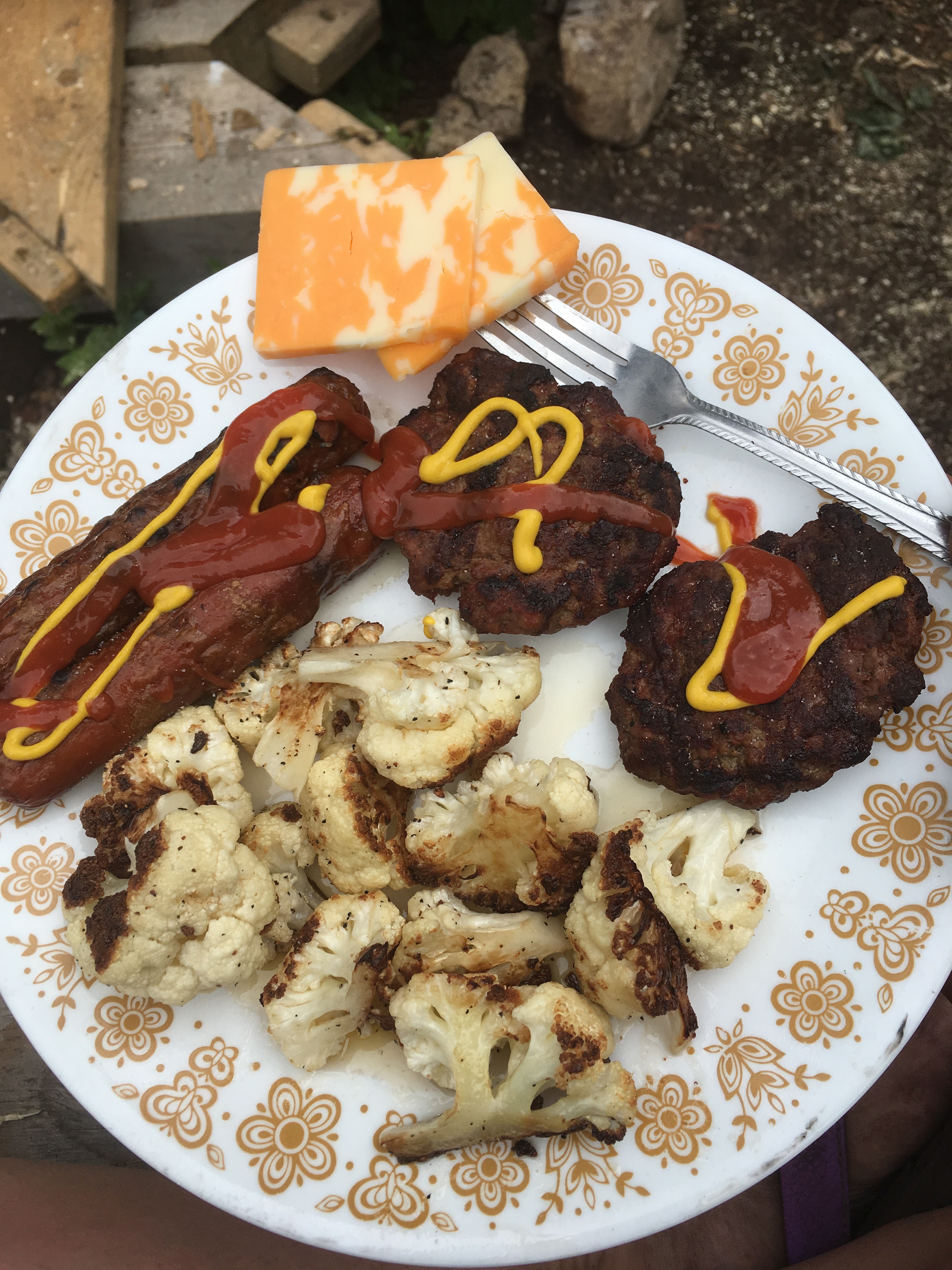 Hot dogs, burgers and fried cauliflower with the butter flavored coconut oil.