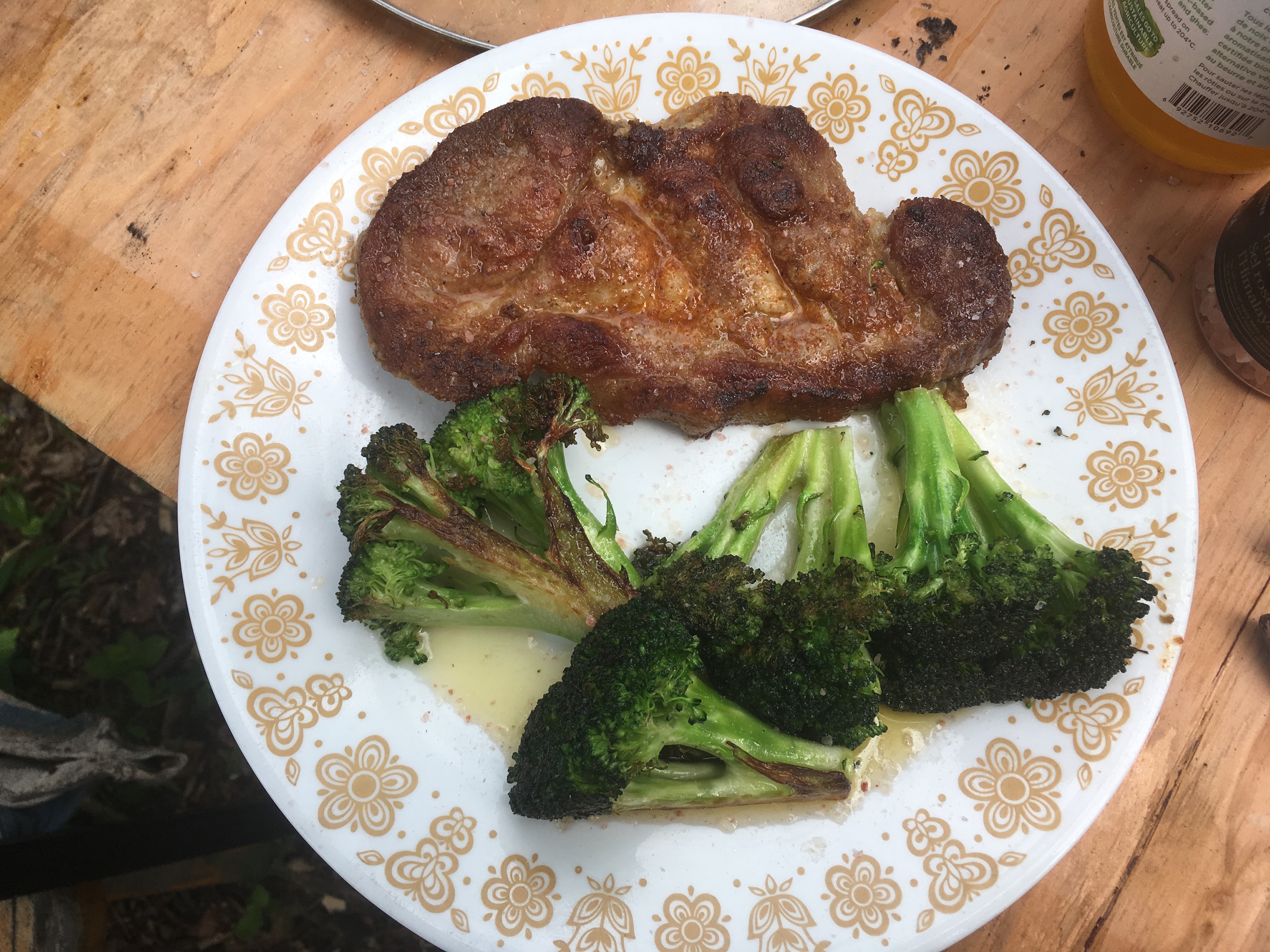 St.Louis style pork steaks and fried broccoli with butter flavored coconut oil (it tastes just like movie theater butter)
