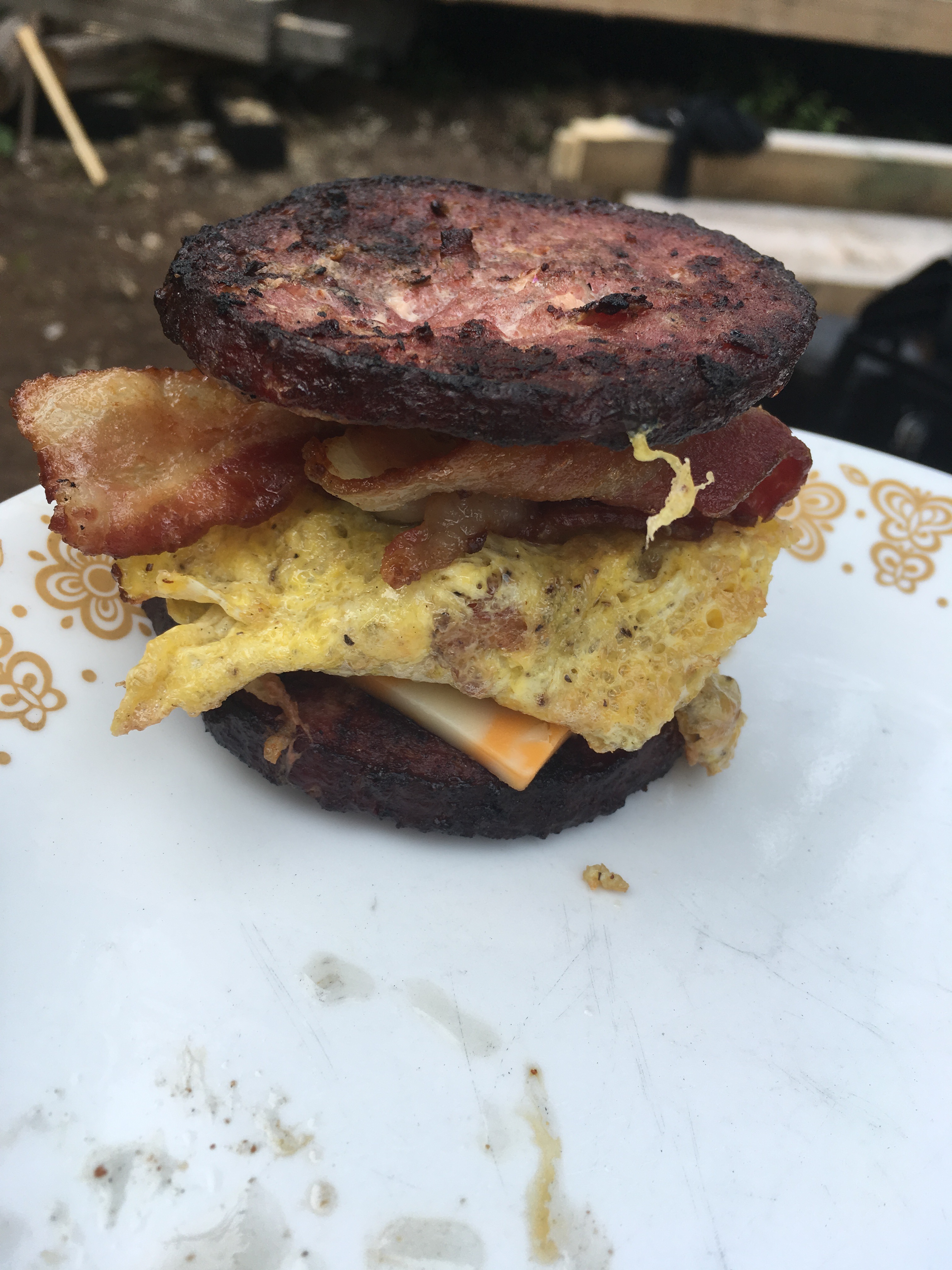 Bacon, egg and cheese sandwich on a smoked farmer sausage bun.