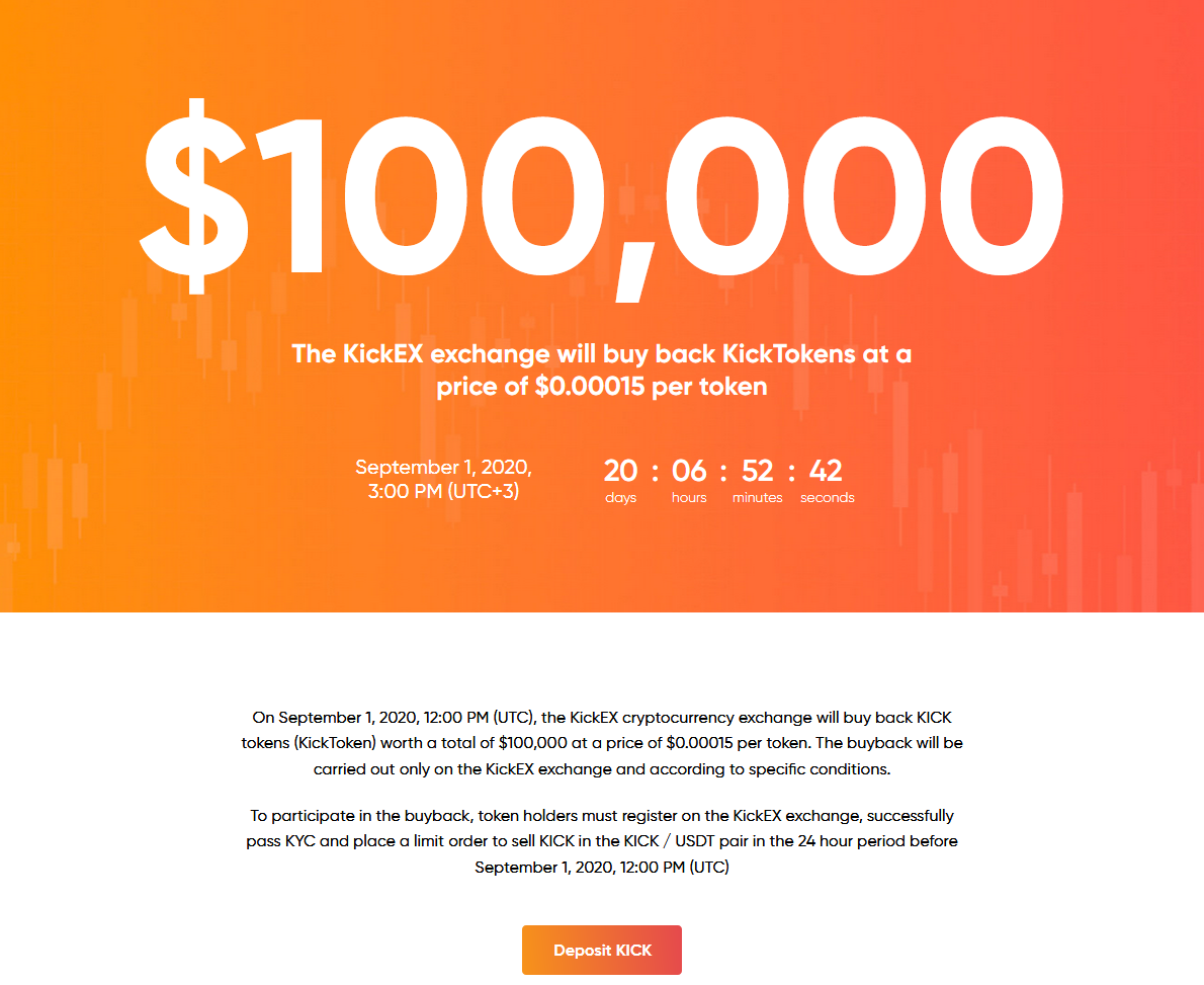 To participate in the buyback, it is necessary to register on the KickEX exchange, successfully pass KYC and place a limit order to sell KICK in the KICK / USDT pair at the time of the buyback. The buyback will occur simultaneously, September 1, 2020, 12:00 (UTC)