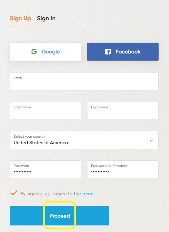 Fill out the sign up form and "Proceed".