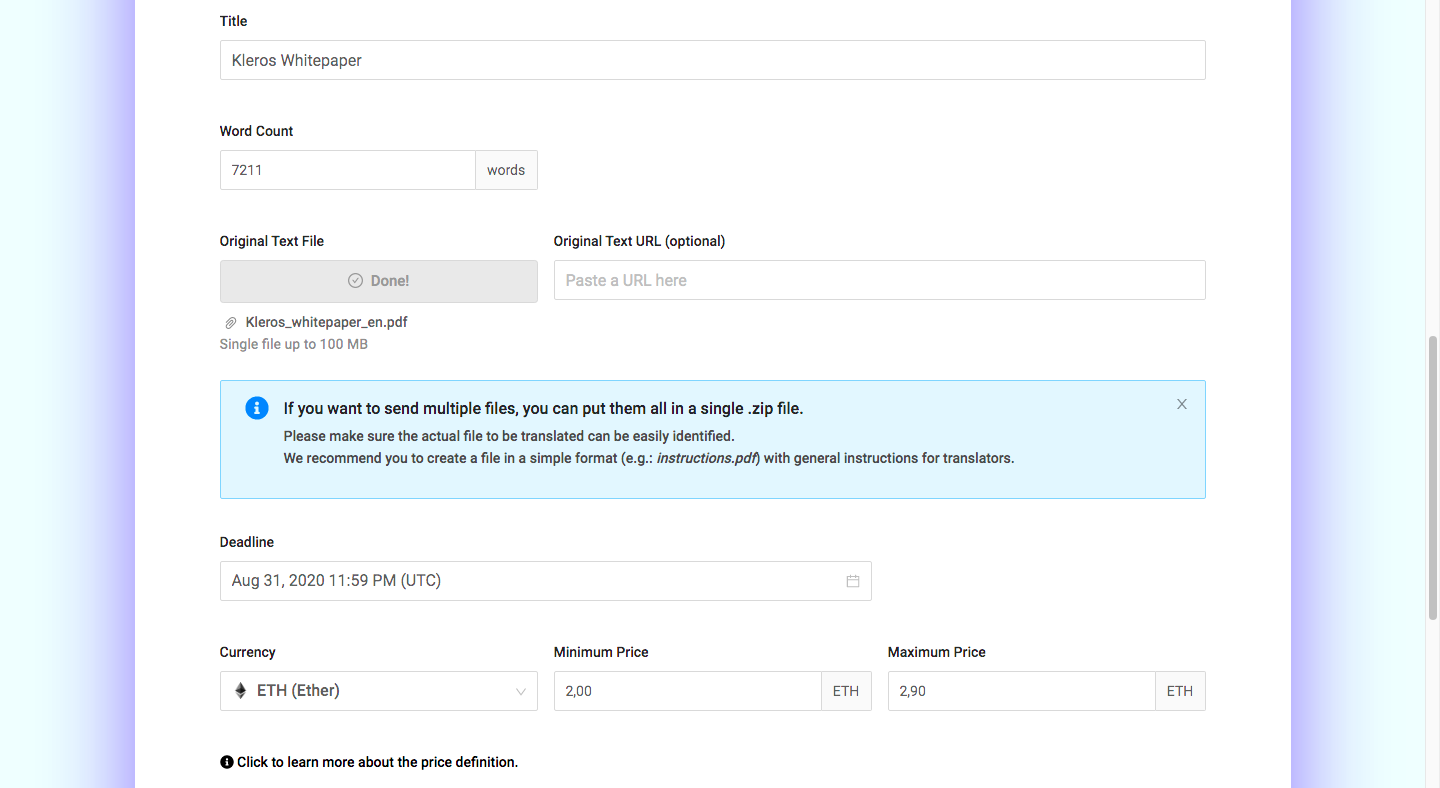 Further I'm asked to fill the required information which including the Title, Word count, Date of the deadline, Payment currency, Min/Max price, and upload a file with an original text that you want to be translated. I will take Kleros whitepaper as an instance. How to count the number of words in the .pdf file? Just google it and you will find a free and simple solution.
