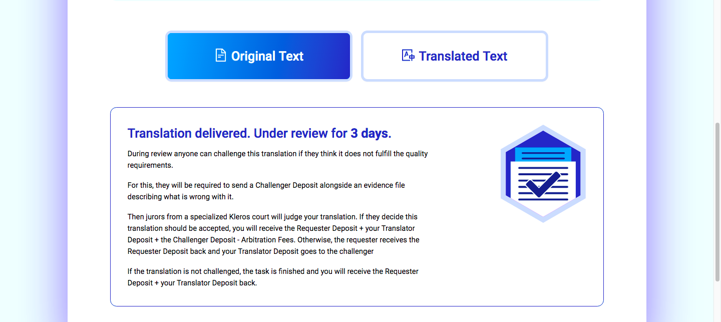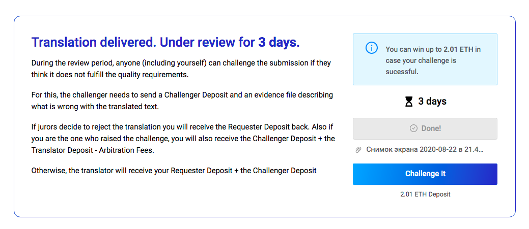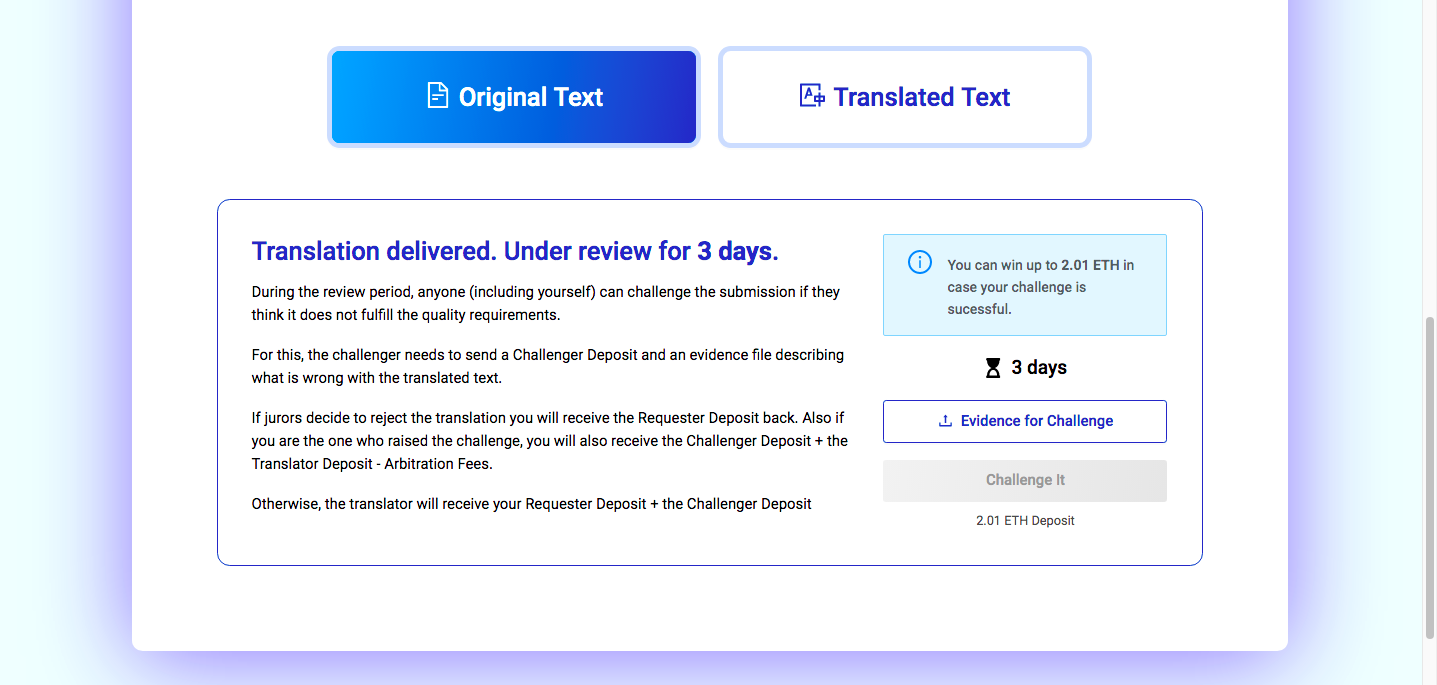 So, I think you've guess that the translator's collateral may be taken only in that case if he has done the really bad work, or didn't manage to do it in time. But who decides to withdraw the translator's funds? If you or someone else decides to challenge the quality of the translation that was provided the case is directing to another, the most popular so far Kleros dApp Kleros Court, where the jurors will review all of the pieces of evidences and make a final decision. And if the challenger is right the translator's funds are moving to him, along with his own dispute collateral that he also must deposit before he disputes the translation. And of course, the customer's funds are moving to the customer's wallet back.