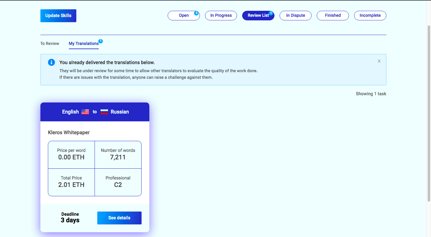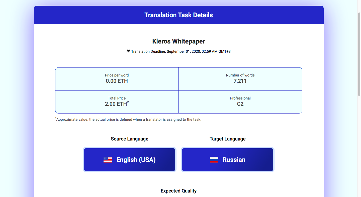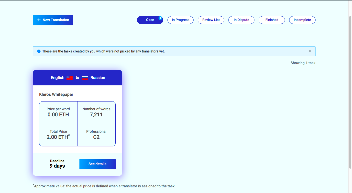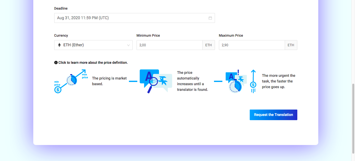 You also could notice that there were two price rows, minimum and maximum. This was done for that reason if your task is waiting for a translator too long, the price for the task starts increasing linearly until someone on the translators' side agrees with the proposed price and takes to perform the task. If the translation completed and submitted before the set deadline there will be three days for jurors to make a decision on the translation. And if everything goes well and jurors approved it, the smart contract returns the translator's collateral along with the payment for his work to his wallet address.