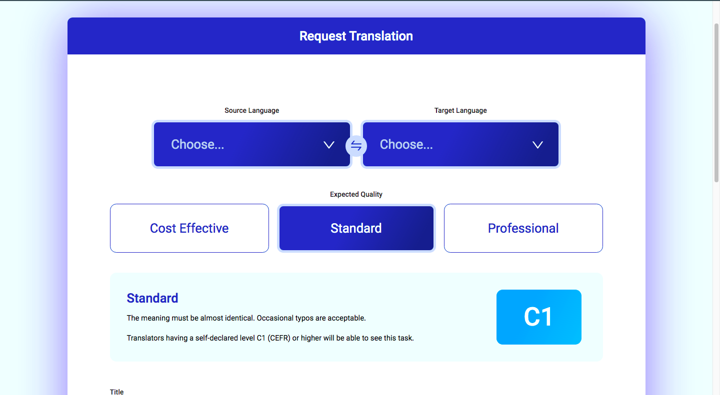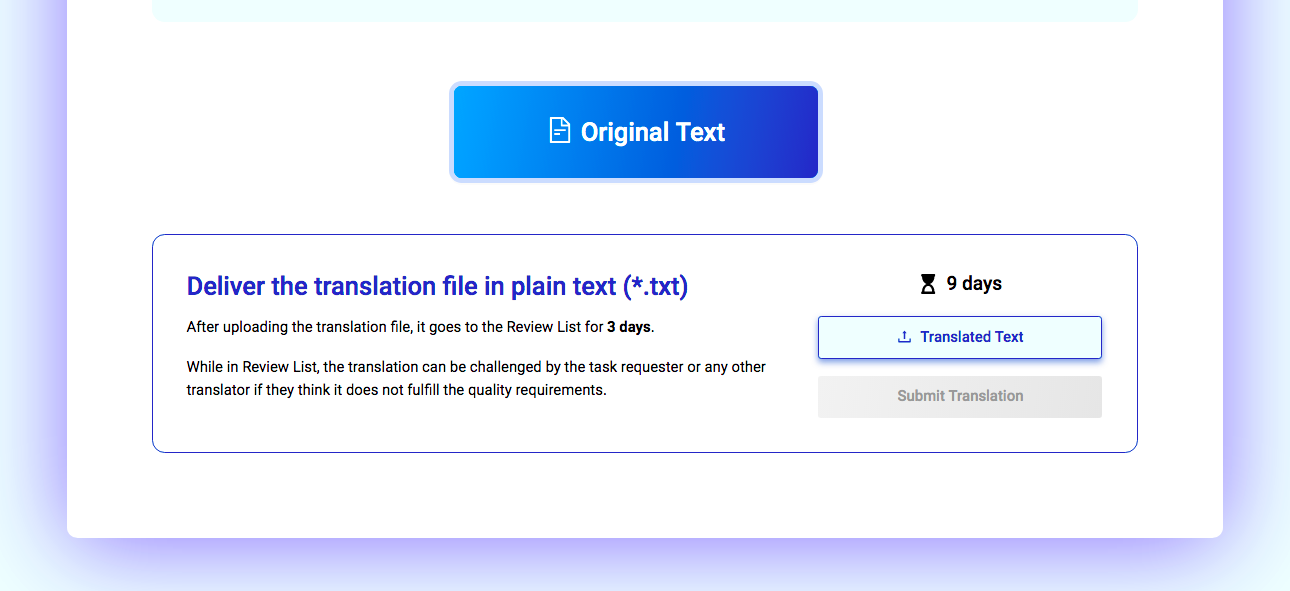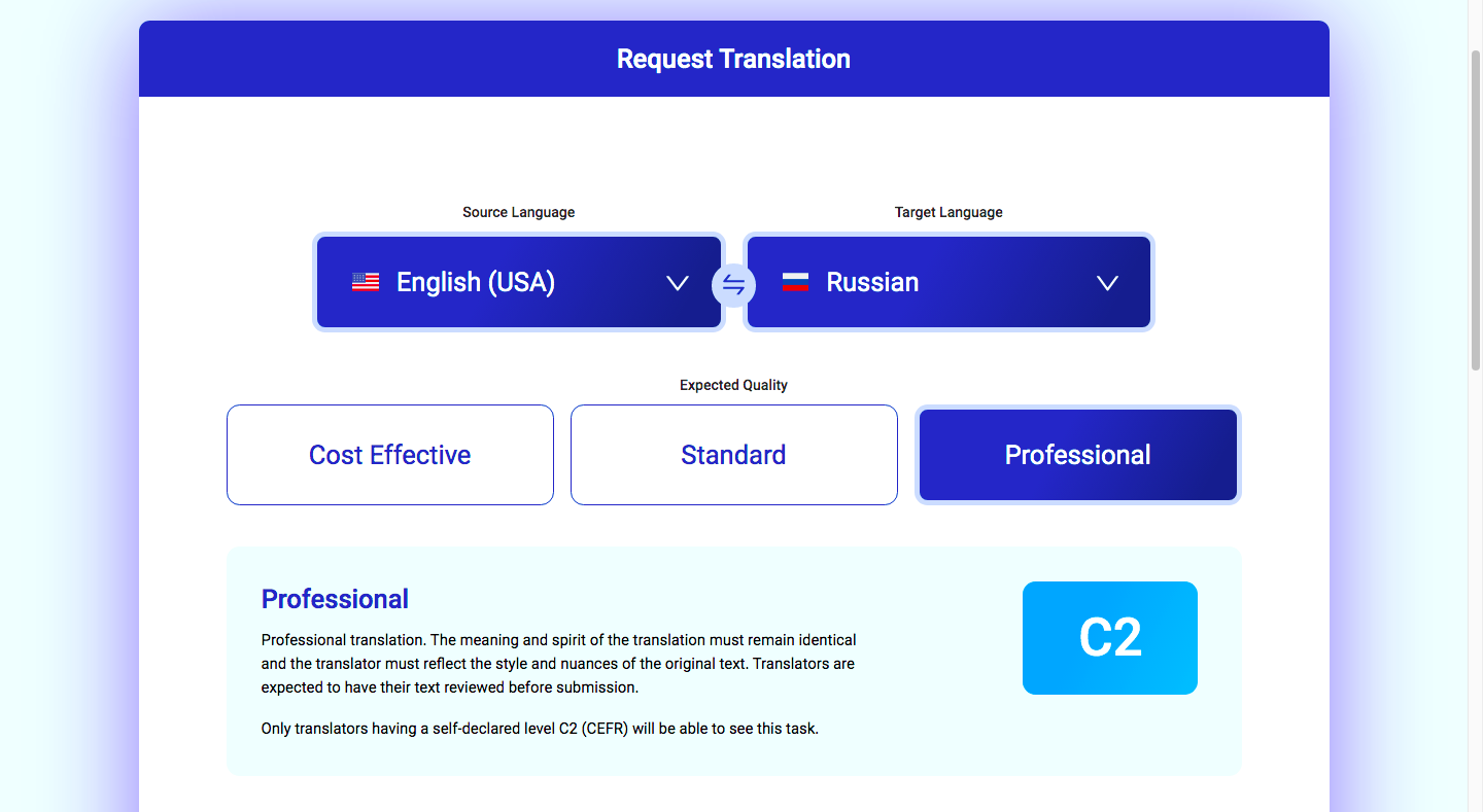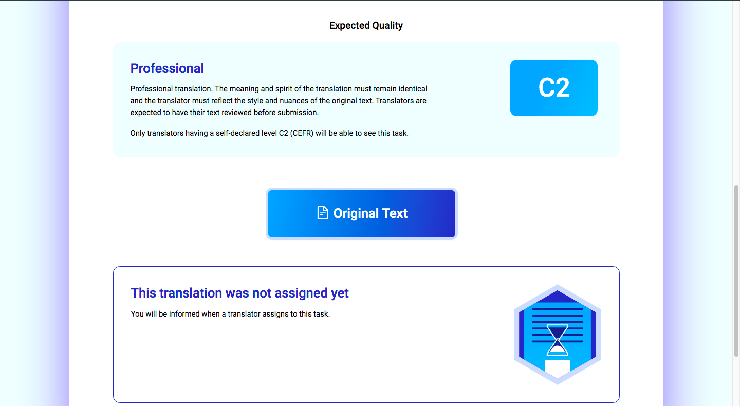 And it's ready. Now I've created the translation task and waiting for a translator with appropriate CEFR language levels takes it to translate.