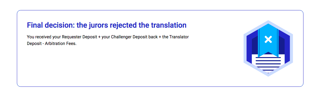After three days I got the jurors' decision, and of course, it was not positive for me as a translator, as was expected. And it also wasn't positive for me as a translation requester, because I spent a lot of my time and didn't get a quality translation. That would be really bad if I had limited time for this task. But, It definitely was a good day for me as a challenger because I earned a translator's deposit.