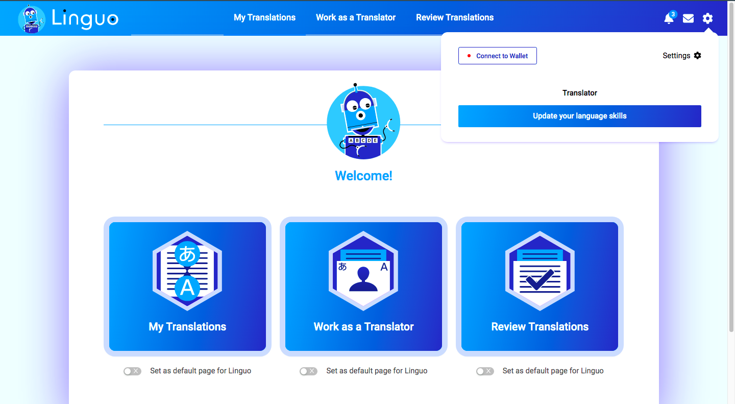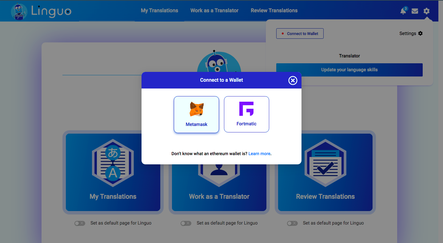 To start you need to have a Metamask or Fortmatic browser extension. I would recommend installing Metamask. You can easily find it on metamask.io or in the browser webstore if you're using a supported one. You also can install a mobile app on your smartphone if you want. After Metamask installed go to linguo-beta.netlify.app and connect your Metamask wallet by clicking on the gear button at the right top angle.