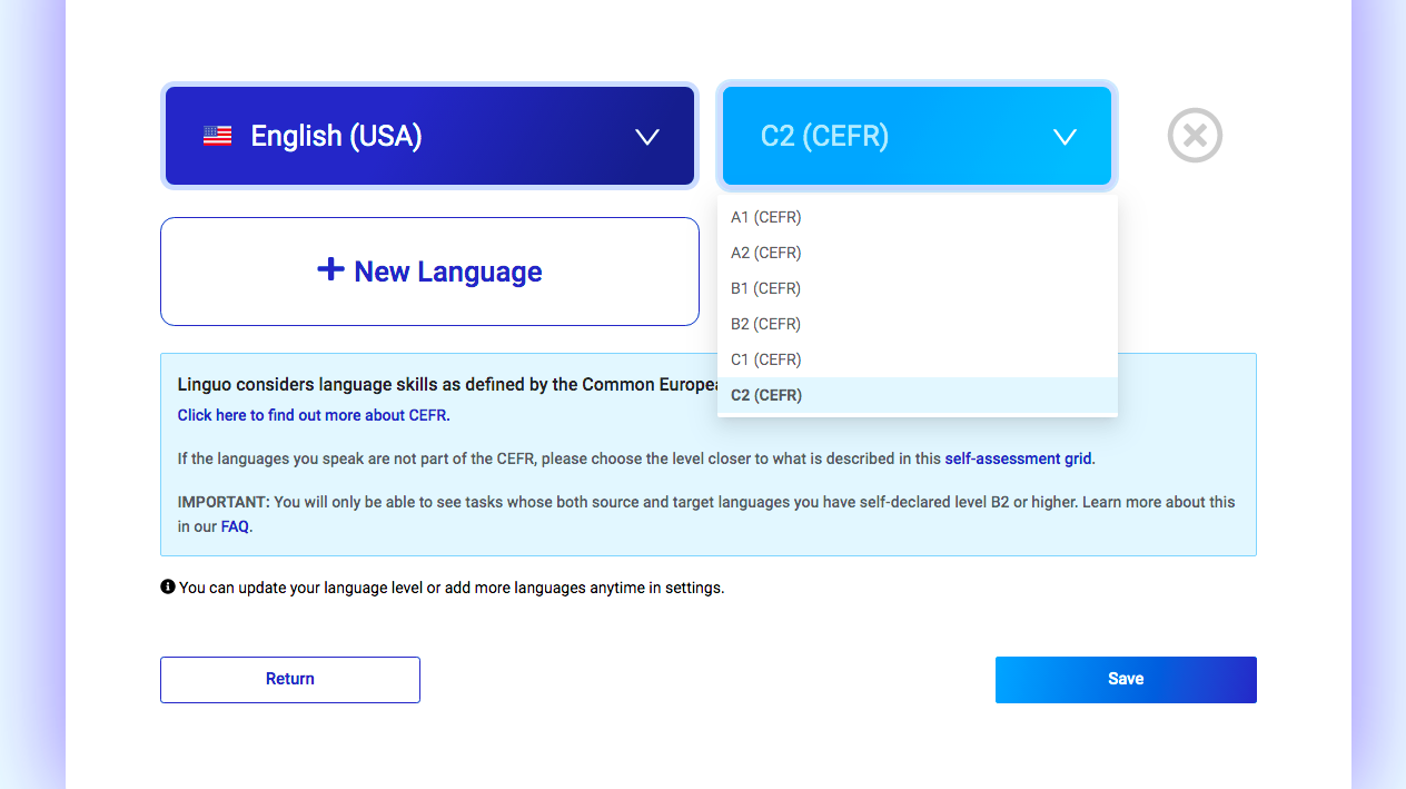 Both languages must have the same CEFR level as it is requested in the translation task, in our case it is C2 level, so I'm choosing it for both English and Russian languages and clicking the "Save" button.