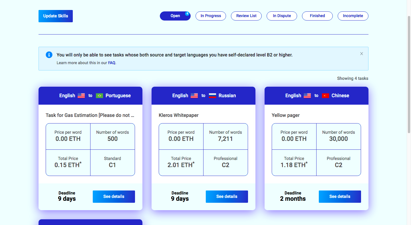 Right after I logged in as a translator I need to set my language skills, otherwise, I will not see available tasks.