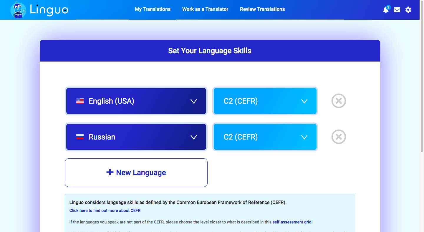 Note: Linguo uses language skills gradations as defined by the Common European Framework of Reference (CEFR), they're explained here: https://www.coe.int/en/web/common-european-framework-reference-languages/level-descriptions