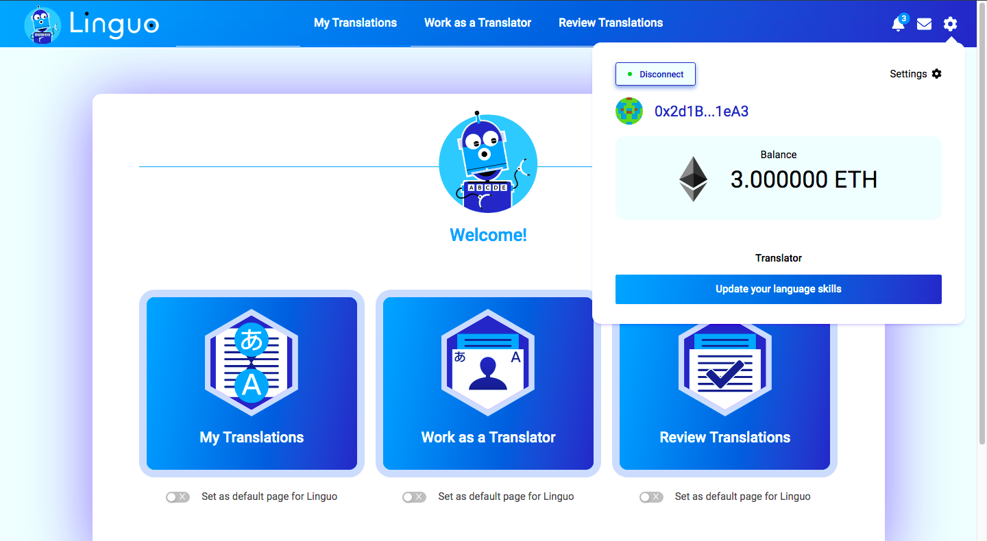 Also, before you start using Linguo or any other dApp, you definitely should learn a bit about Ethereum, smart-contracts, gas fees, and dApps deployed in this network. In short, dApp is something like an interface that interacts with the blockchain network through the use of smart contracts. There may be not only one smart-contract at the core of dApp, but a couple, or even a lot of them interacting between each other and hidden under the pretty and simple user interface. And this means that all your interactions with other users are automated and decentralized. There is no person or centralized server that can impact the final decision or take any compromising actions. Everything is pre-coded, automated, audited many times, and waiting for your proper actions to launch the process.