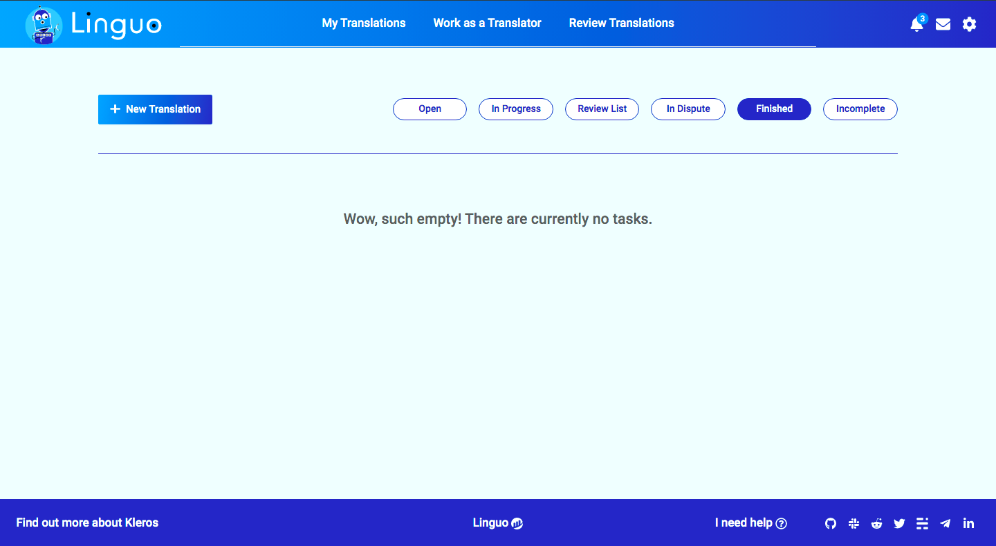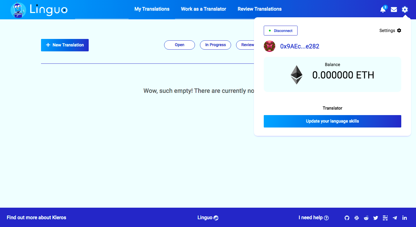 That's why Kleros decided to deploy LInguo dApp. There will be no need to trust a translator or company that provides such services, or any other party if you order a translation in Linguo dApp. You also will no need financial services providers, since all payment transactions will be managed by a smart-contract in Ethereum network, and the Linguo dApp serves as an escrow for all of the payments.