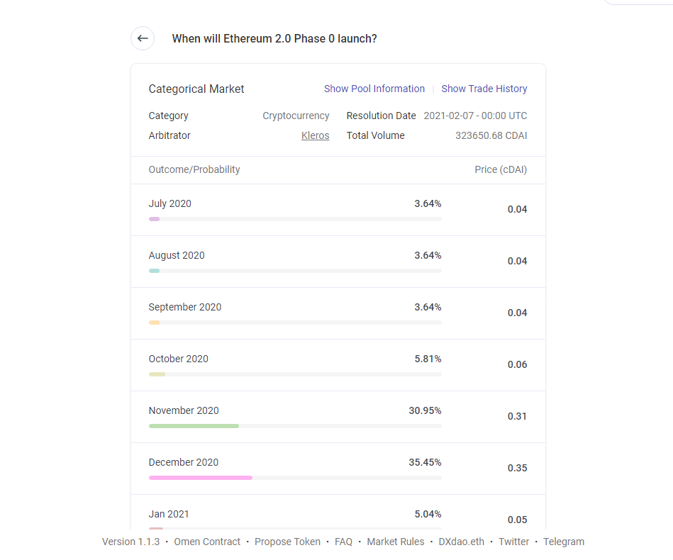 К примеру, если создали прогноз «Кому повезет больше на выборах в США в этом году» и будет всего 2 варианта «Трамп» и «Байден», то здесь споров никаких не будет. А если зададут такой вопрос «Когда именно запустят первую фазу блокчейна Ethereum 2.0?», а варианты ответа распределят по месяцам. Вроде бы споров не должно быть.