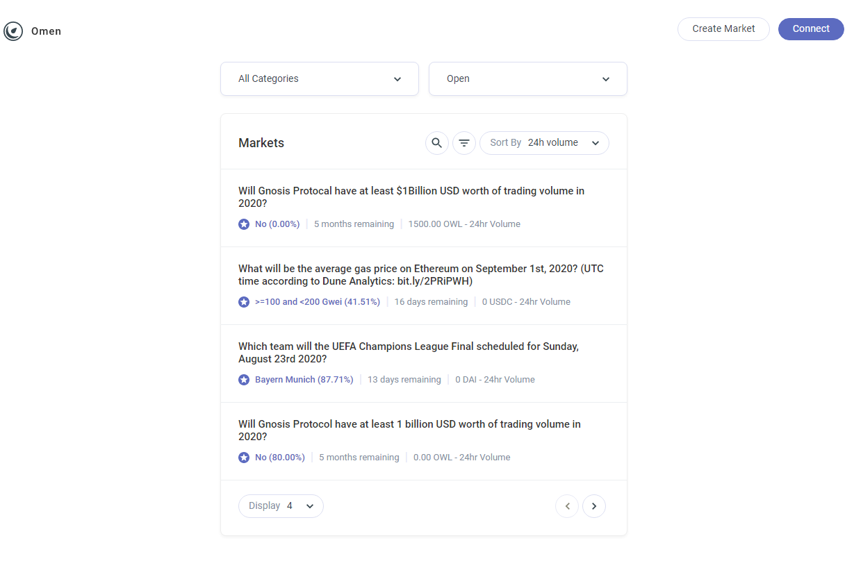 Что касается Gnosis Omen, то он представляет собой децентрализованный рынок предсказаний и прогнозов. На нем каждый из пользователей может создать рынок по тому или иному прогнозу. Исходя из числа голосов, которые наполняют пул и от исхода события, могут вполне неплохо заработать на прогнозах.