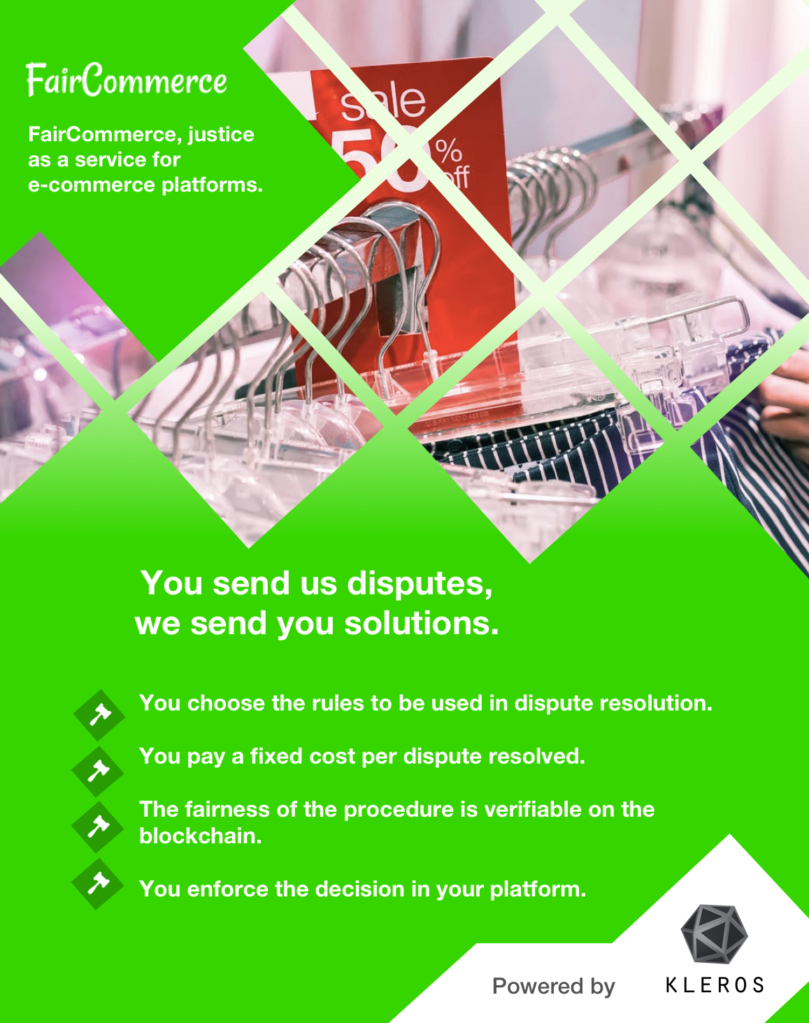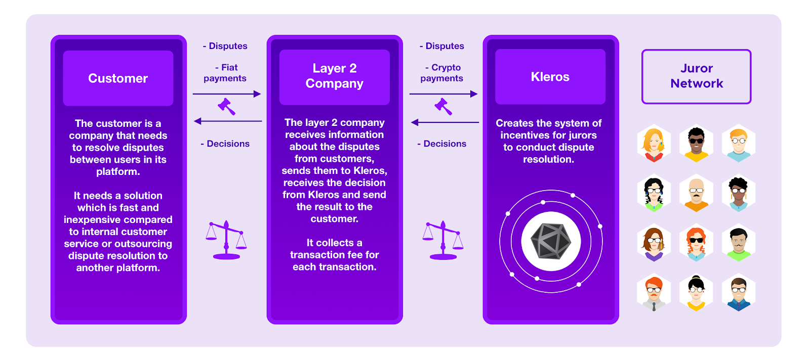 Но представьте, если бы такие споры решались в Kleros? Всё было бы намного честнее и эффективнее, а в некоторых смыслах даже дешевле. И чтобы сотрудникам магазина ООО "Рога и Копыта" самим не пришлось разбираться, с тем как работает Ethereum и децентрализованный суд Kleros, они нанимают фирму ООО "Честный суд" в качестве посредника.