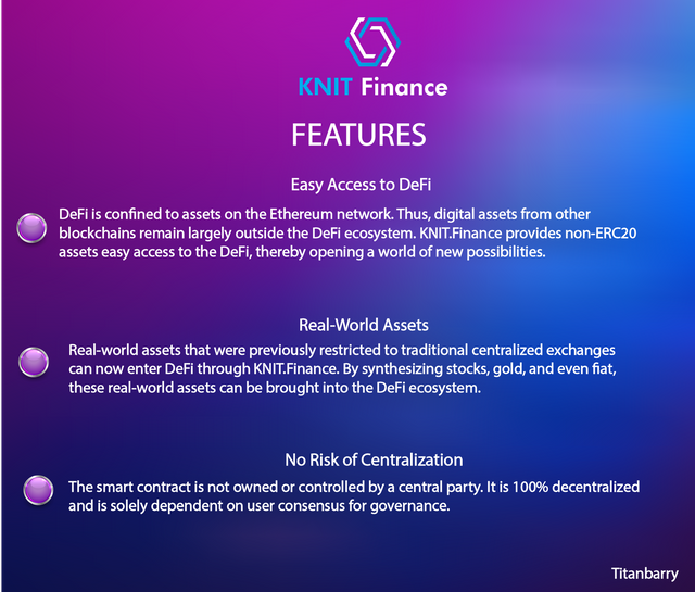 As depicted above and as indicated on the official website of KNIT Finance, KnitFinance is a unique decentralized protocol that combines synthetics across multiple chains, Bridges, and real-world markets with yield, lend, trade and margin services through smart contracts. This also gives cross-chain liquidity aggregation in a Completely transparent 100% verifiable. Community-led initiative.