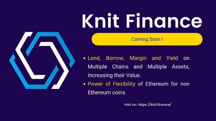 KNIT. Finance is the next generation of Defi protocol that aims to bridge multiple non-Ethereum chains with ERC20 in Phase 1. Any digital, lockable asset can be leveraged with KNIT. Finance by generating equivalent synthetic tokens in a 1:1 ratio, hence unlocking billions of dollars and trade access which can be censor proof.