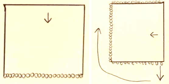 When I’d knitted about 16cm I stopped, cut the yarn and picked up 35 stitches along one side, recovered the open stitches and then picked up another 35 stitches on the other side - hope you can understand my crazy drawings above.