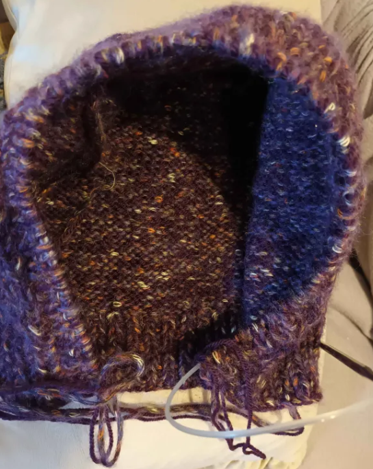 The straight edge you see above then became the ‘forehead’. I continued knitting straight which was a bit uncomfortable because of the shape, but I persevered. When I’d knitted enough to reach my chin length I started to knit about 6 rows of ribbing (one purl and one knit stitch) which became the bottom of the bonnet.