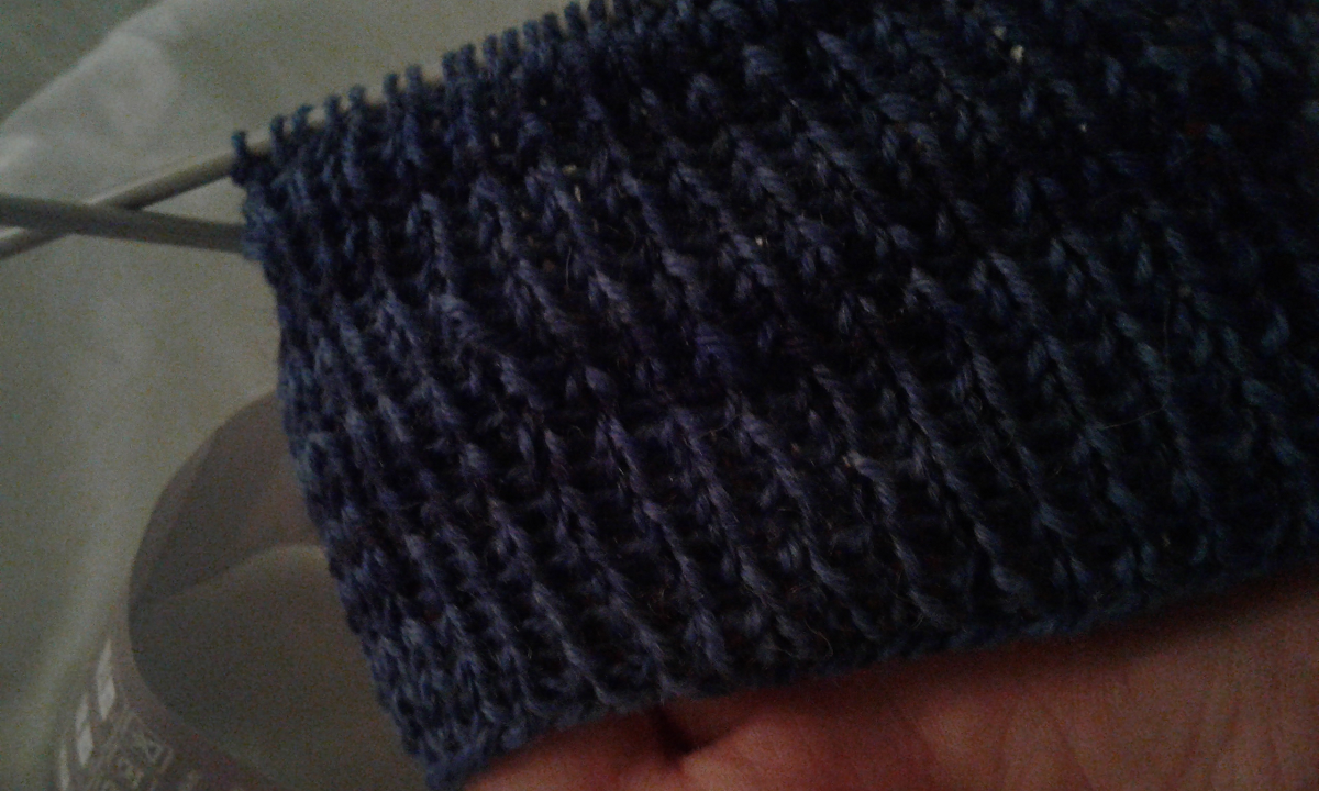 The pattern calls for stockinette stitch around the hand with a panel of 1x1 ribbing running from bottom to top across where the thumb will be. It looks really nice in the examples, so fingers crossed that it will turn out well.