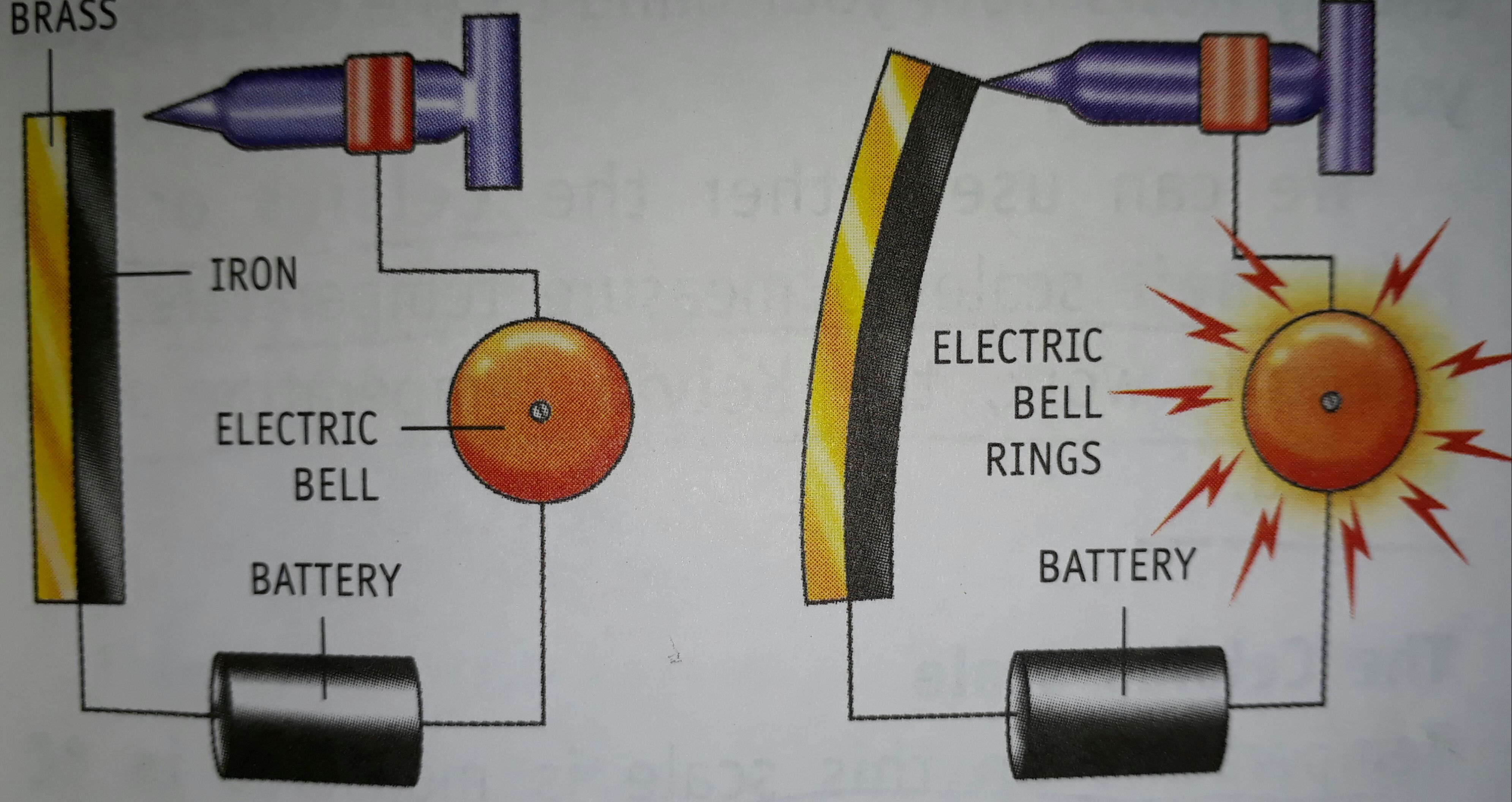 The automatic fire alarm system uses the fact that different solids expand by different amounts on heating . The alarm contains two metal stripes , one of iron and the other of brass , firmly bolted together . Brass expands more than iron on heating . Therefore , when this bimetallic strip gets heated because of fire , it bends on the side of iron . As it bends , the circuit of the electric bell is completed . The starts ringing to give the alarm . As the fire is put out , the strip gets cooled and straightens again . This causes the circuit to break , thus switching off the alarm .