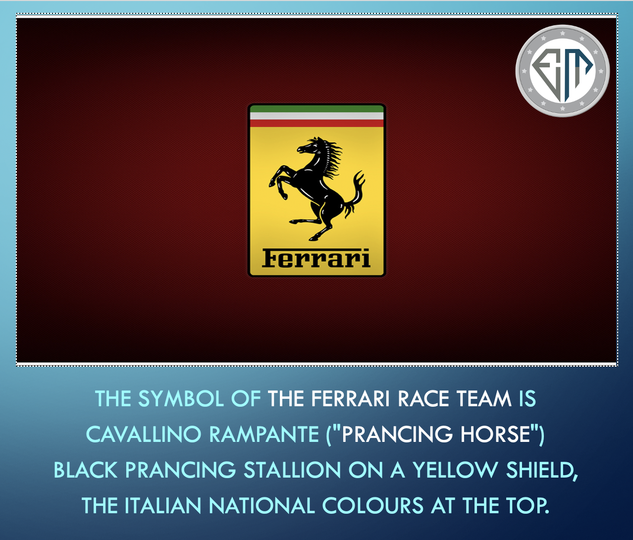 The famous symbol of the Ferrari race team is the Cavallino Rampante ("prancing horse") black prancing stallion on a yellow shield, usually with the letters S F (for Scuderia Ferrari), with three stripes of green, white and red (the Italian national colors) at the top.
