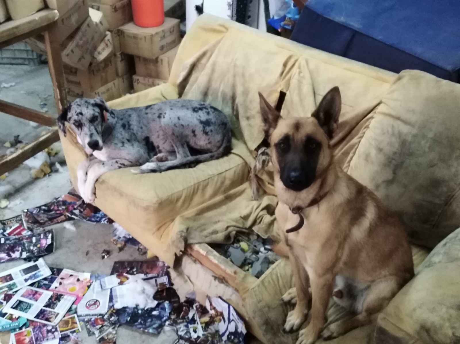 Son mis Perrhijos Fiona y Denzel cuando los estoy regañando porque despedazaron una caja de cómics de mi marido. Mas de 200 revistas destruidas y muchos miles de pesos. ah! y el sillón de hace un mes.