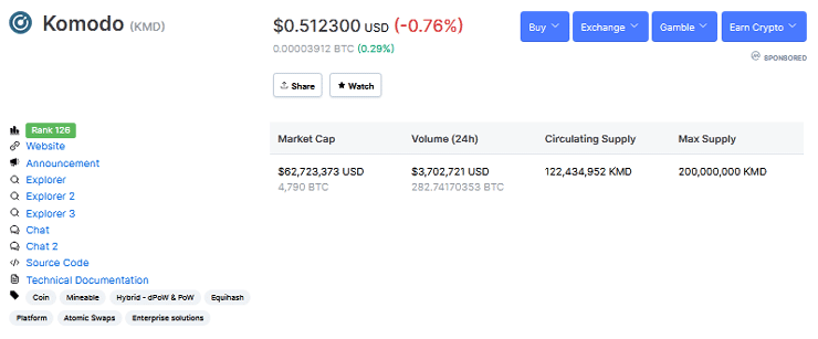 October 26, 2020 - Komodo (KMD) current price is about $0.512300 and the rank is 126 on Coinmarketcap.com, the price in BTC is about 0.00003912 BTC.
