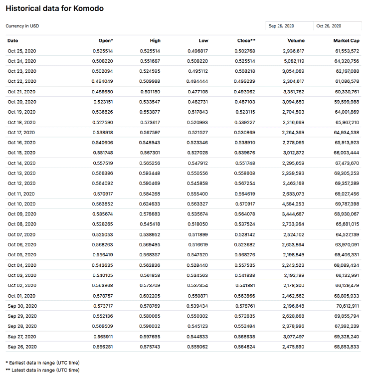 This post is a report regards Komodo price and Komodo rank in the cryptocurrency market as show on Coinmarketcap.com at date October 26, 2020.