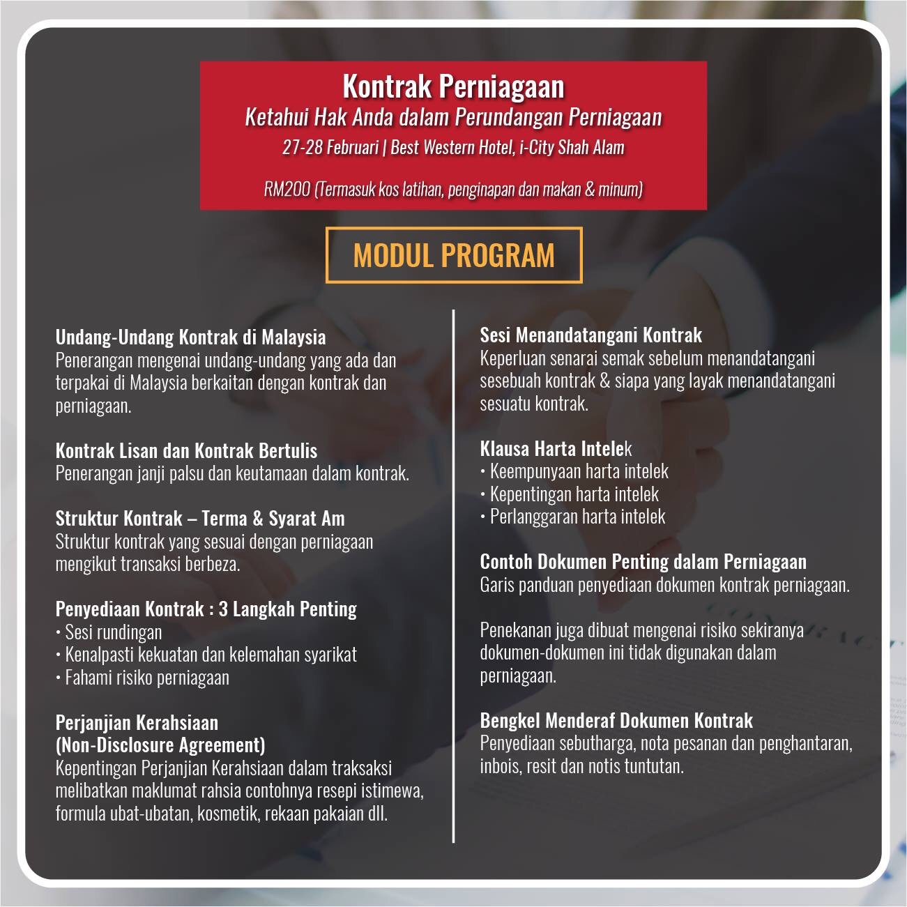 Kami janji pada anda, program ini sarat dengan informasi yang dapat membantu anda menangani isu-isu berkaitan kontrak perniagaan. Sangat mudah difahami jika anda tidak tertidur semasa program ini berlangsung.