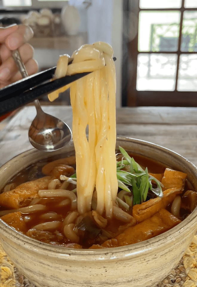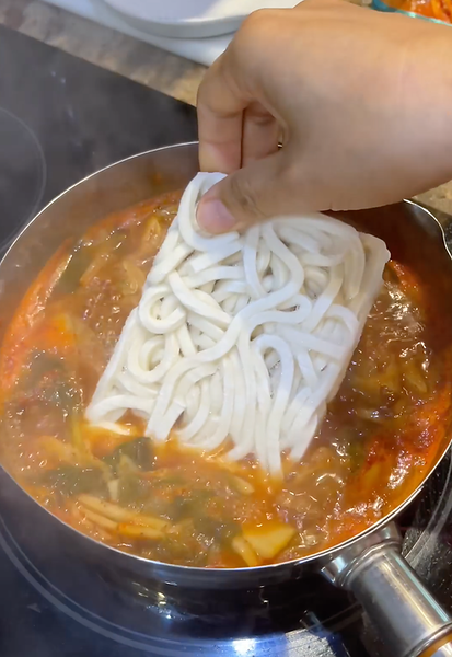국물을 다시 끓여서 얼린 우동 2인분을 추가합니다. 좀 더 맑은 국물을 원하시면 따로 끓는 물에 면을 삶아도 되지만 이건 제가 게으른 음식이라 국물에 삶는 것을 좋아합니다. 말린 우동을 사용할 경우 별도의 끓는 물에 삶는 것을 권장합니다.