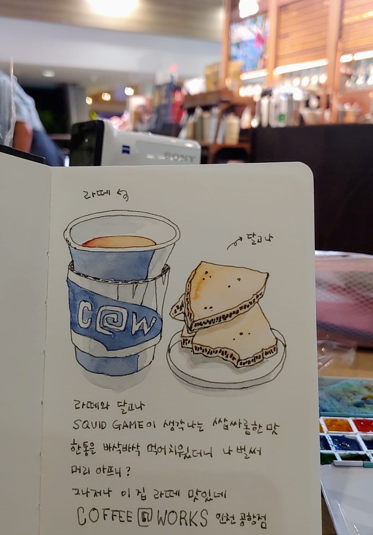 travel sketch 공항 airport 2andol7 (35)in Korea • 한국 • KR • KO • 4 years ago (edited) Dalgona & coffee 어릴때는 달고나 (뽑기라고 했다) 를 길에서 옹기종기 앉아서 사먹었는데, 오징어게임처럼 게임도 하고 (물론 망친다고 죽이지는 않았다) 돈을 더 주면 도너츠처럼 크게 한개를 만들어 주기도 했다. 이제 카페에서 커피와 함께 디저트처럼 달고나를 파는구나. 예쁜 포장으로 럭셔리하게 커피와 함께 즐긴다 . 물론 어릴때에 비하면 값도 럭셔리 하다. 달콤 쌉쌀~ #zzan #sketch #doodling #drawing #travel #art #life
