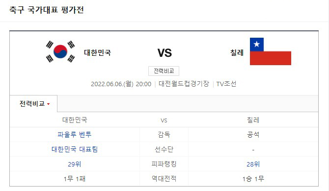 오늘 (6월 6일 월요일) 밤 8시에는 "한국 대 칠레" 축구 국가대표 평가전이 대전 월드컵 경기장에서 펼쳐집니다.