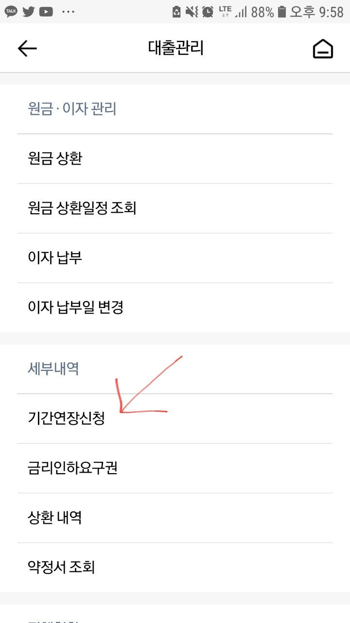 케이뱅크 앱으로 들어가서~~ 대출 관리를 누르면 기간 연장 신청이 나옵니다.