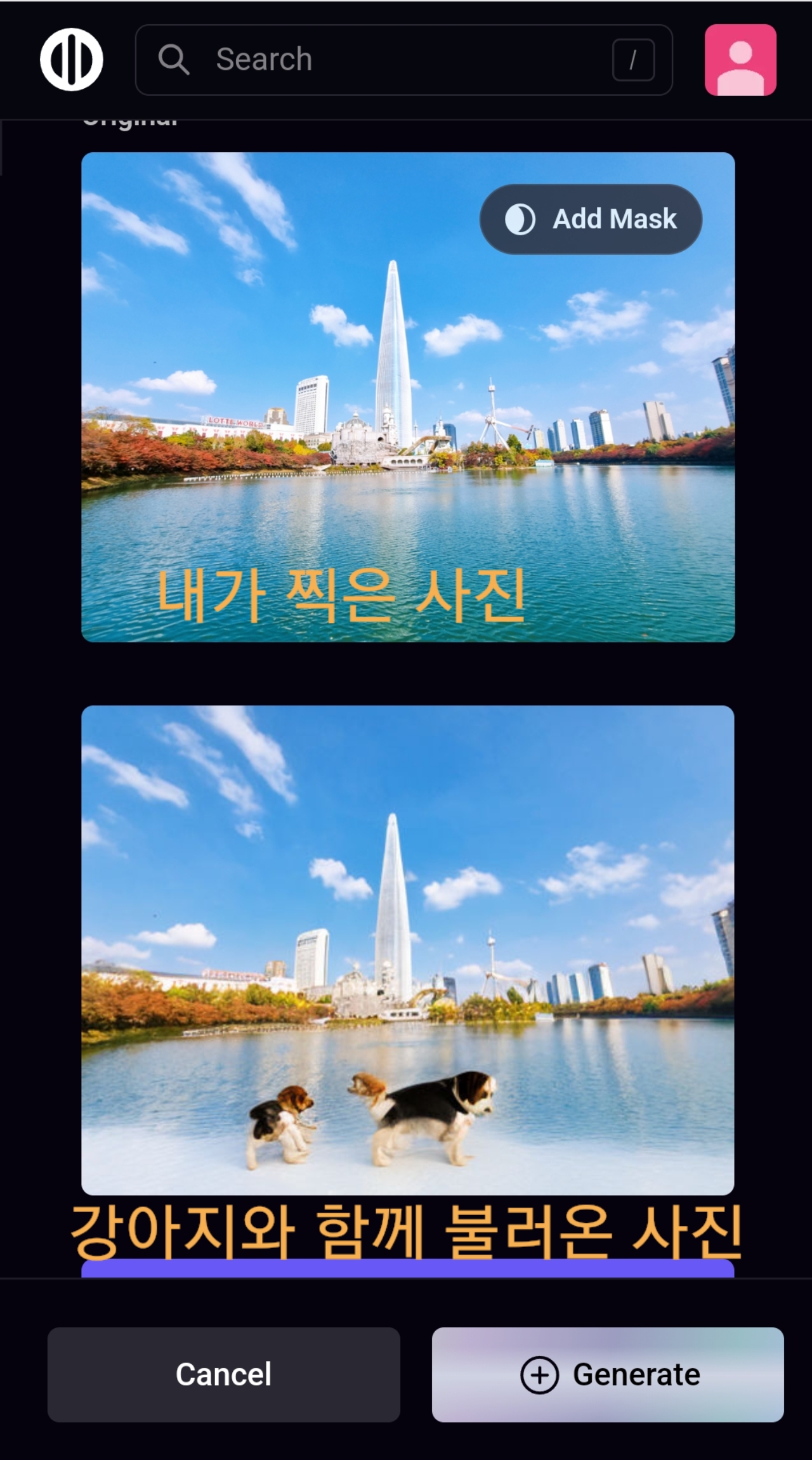그리고 제가 찍은 사진을 불러들여 baby dog과 함께 그리기 요청을 했습니다.