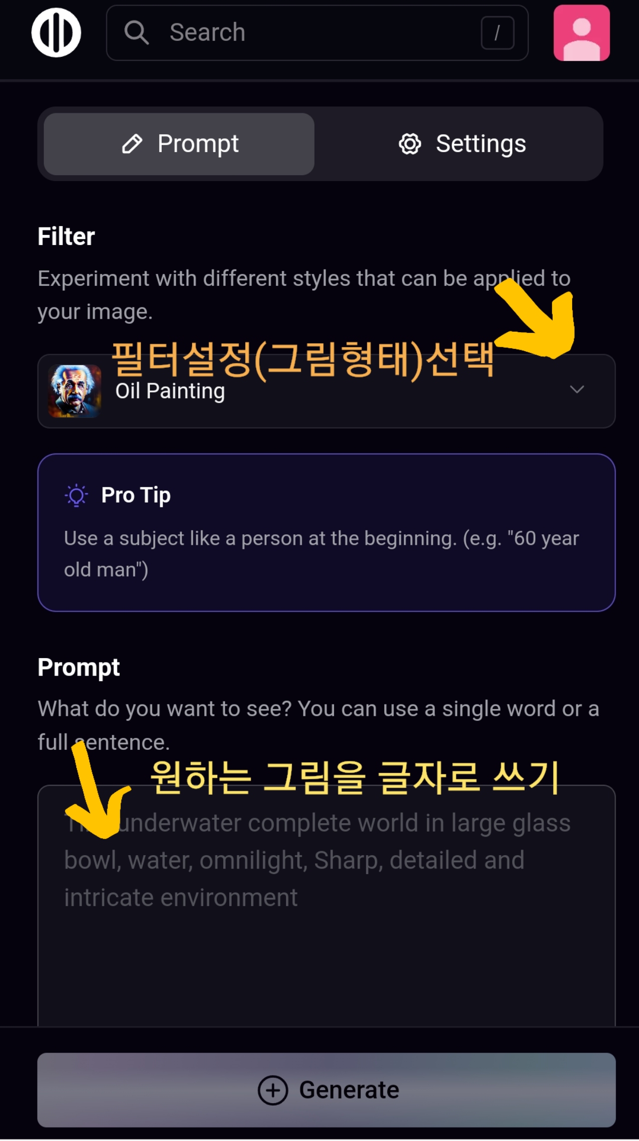 로그인 후 prompt 에 원하는 그림을 영어로 쓰면됩니다.