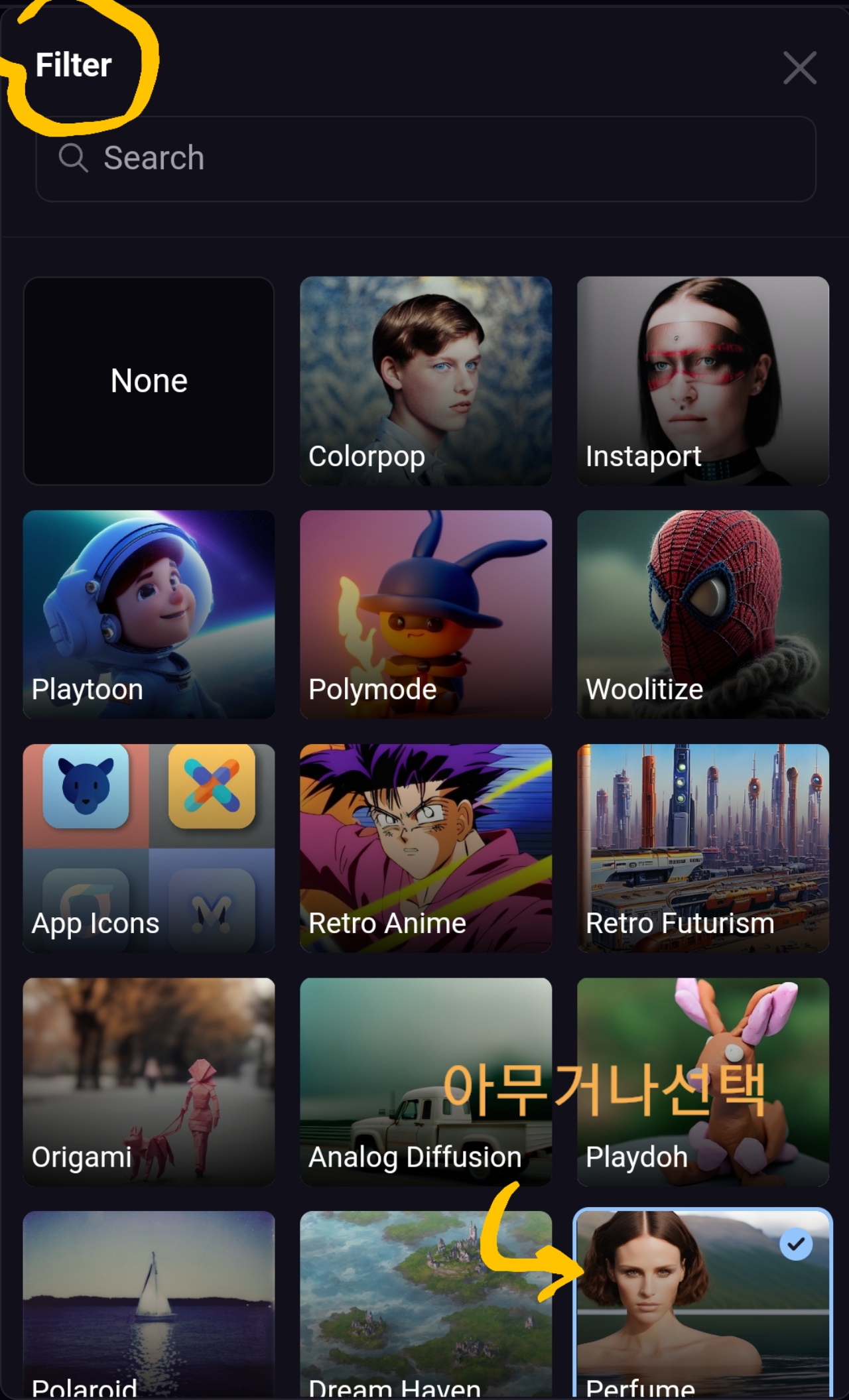 위쪽 필터 설정은 그림의 형태. 즉, 애니메이션 형태인지 유화 물감 형태인지 그림의 형태를 고르면 됩니다.