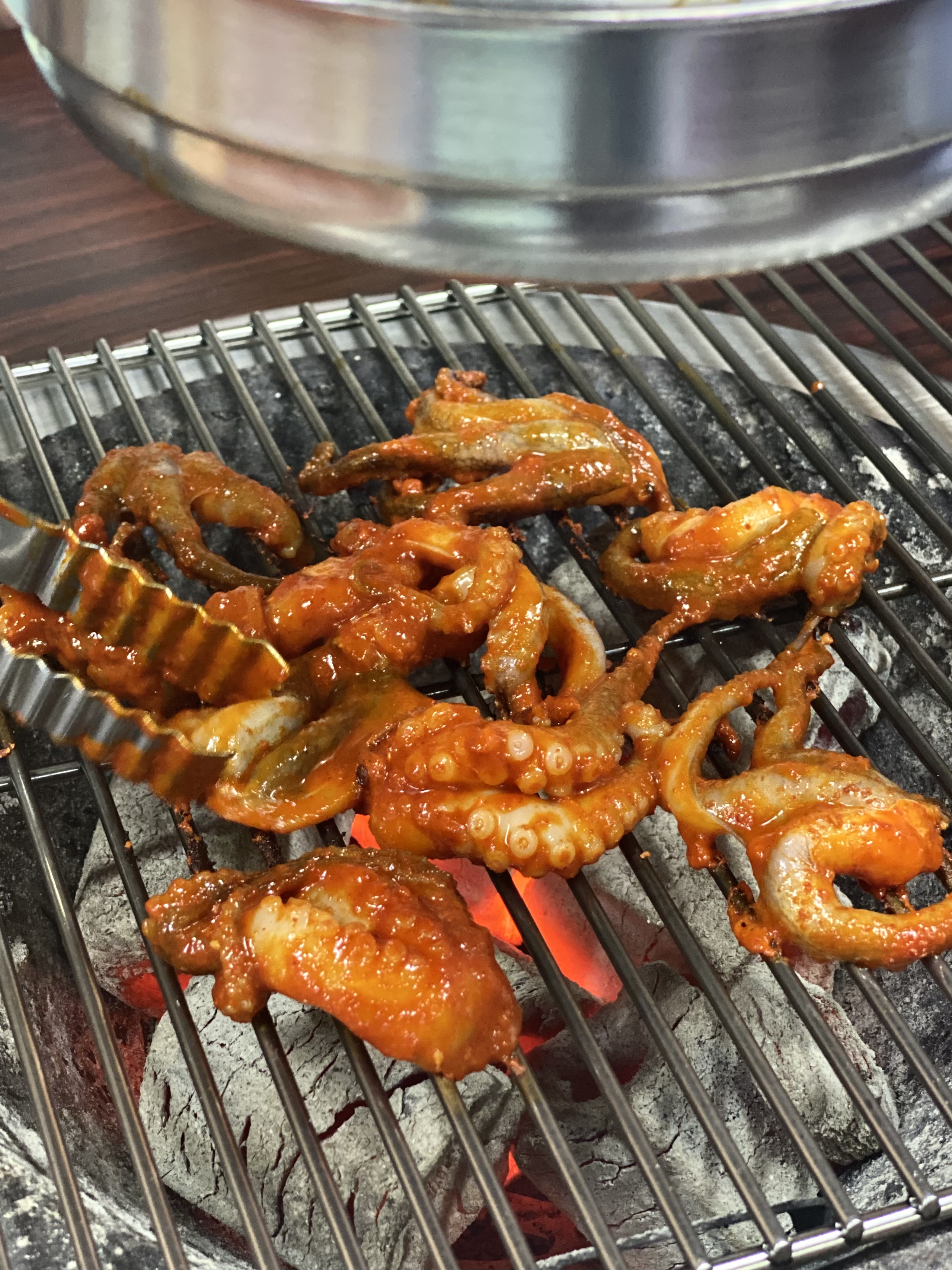 연탄불에 잘 구워지더라구요!! 탱글~탱글, 톡~톡 씹히는 쭈꾸미 맛이 일품이었습니당!!! 매워보일 수 있지만 전혀 맵지 않고 맛있었습니당ㅎㅎㅎ
