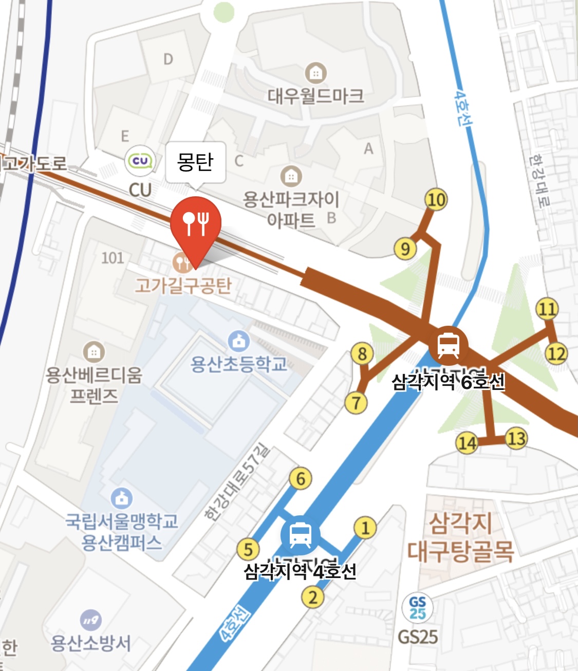 지하철 기준 삼각지역 8번 출구 근처에 위치하고 있습니당!