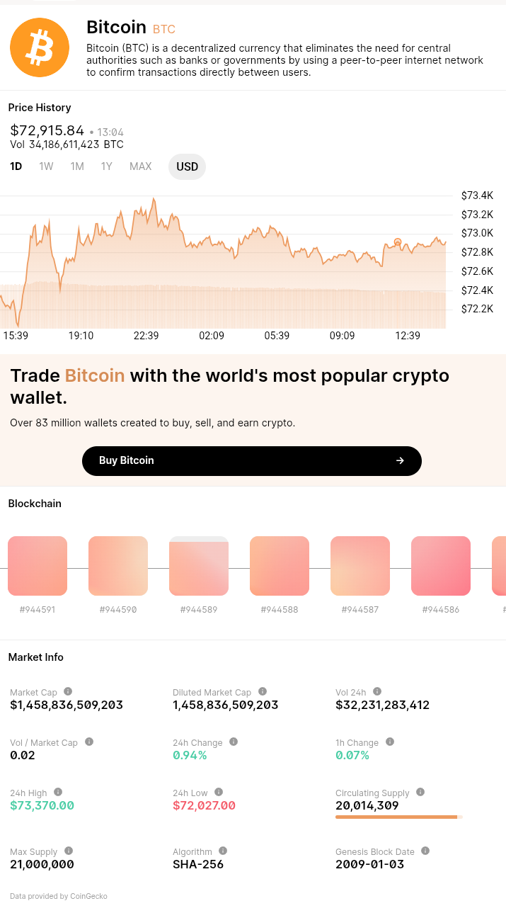 ๋น„ํŠธ์ฝ”์ธ(BTC)์€ ์€ํ–‰์ด๋‚˜ ์ •๋ถ€ ๊ฐ™์€ ์ค‘์•™ ๊ถŒํ•œ ์—†์ด ์‚ฌ์šฉ์ž ๊ฐ„ ์ง์ ‘ ๊ฑฐ๋ž˜๋ฅผ ํ™•์ธํ•˜๋Š” ํ”ผ์–ด ํˆฌ ํ”ผ์–ด ๋„คํŠธ์›Œํฌ๋ฅผ ์‚ฌ์šฉํ•˜์—ฌ ํƒˆ์ค‘์•™ํ™”๋œ ๋Œ€ํ‘œ์ ์ธ ์•”ํ˜ธํ™”ํ์ž…๋‹ˆ๋‹ค. ์ตœ์‹  ๋ฐ์ดํ„ฐ ๊ธฐ์ค€์œผ๋กœ ๋น„ํŠธ์ฝ”์ธ์€ ์•ฝ $72,915.84์— ๊ฑฐ๋ž˜๋˜๊ณ  ์žˆ์œผ๋ฉฐ, ์•ฝ $72,027์—์„œ $73,370 ์‚ฌ์ด์—์„œ ์•ฝ๊ฐ„์˜ ์ผ์ค‘ ๋ณ€๋™์„ ๋ณด์ด๊ณ  ์žˆ์Šต๋‹ˆ๋‹ค.